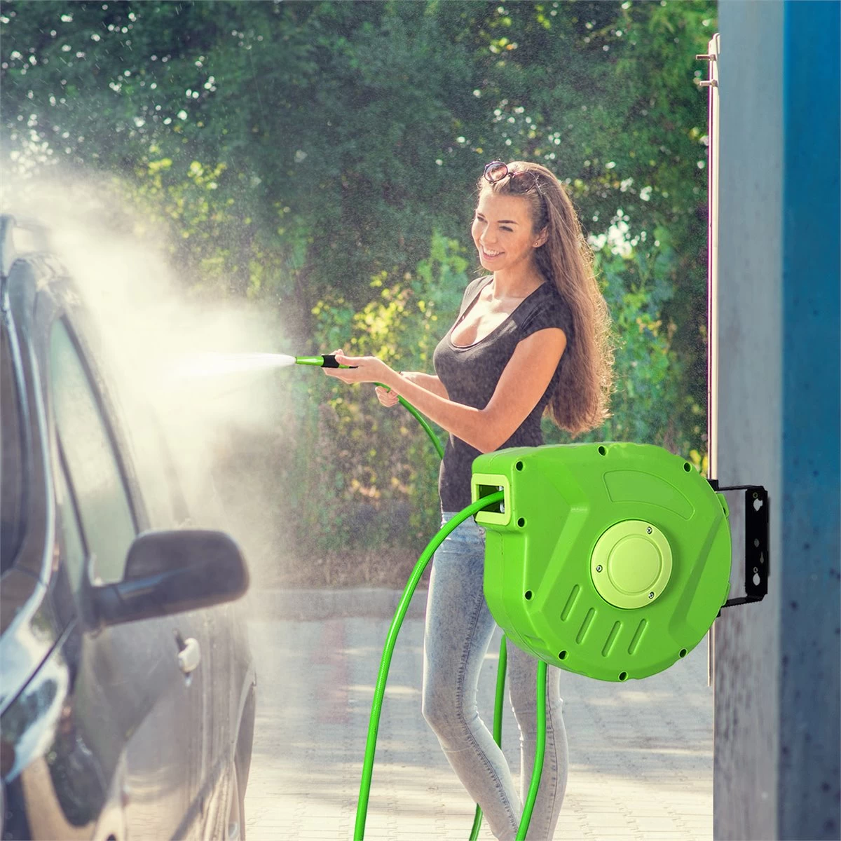 - – MULTIFUNCIONAL Y PRÁCTICO: Esta manguera con carrete retráctil y soporte para fijar en la pared es ideal para regar el jardín y las flores, limpiar el coche, bañar a tu perro o cualquier otra mascota, limpiar las losetas del camino de entrada a tu casa y más – RETRÁCTIL Y BLOQUEABLE: Este carrete con manguera de agua tiene una función de bloqueo para que puedas fijar la manguera a cualquier longitud tirando de ella. De este modo podrás extenderla a la medida justa y no tener la manguera con enredos por el suelo – SOPORTE GIRATORIO DE 180°: Aunque podrías usarlo sin fijar, lo apropiado es fijar el carrete en la pared con los accesorios de montaje incluidos. Su instalación va a permitir su buena funcionalidad, y, además, su soporte permite girar el carrete con la manguera 180º – ESTRUCTURA RESISTENTE: Fabricada en PP de alta calidad, la manguera de PVC y con un resistente soporte de pared permite que la manguera se utilice de forma segura durante mucho tiempo – MEDIDAS TOTALES: 35,5×11,5×27,5 cm (LxANxAL. Manguera de conexión: 1 m. Longitud de la manguera 10 m. Requiere montaje