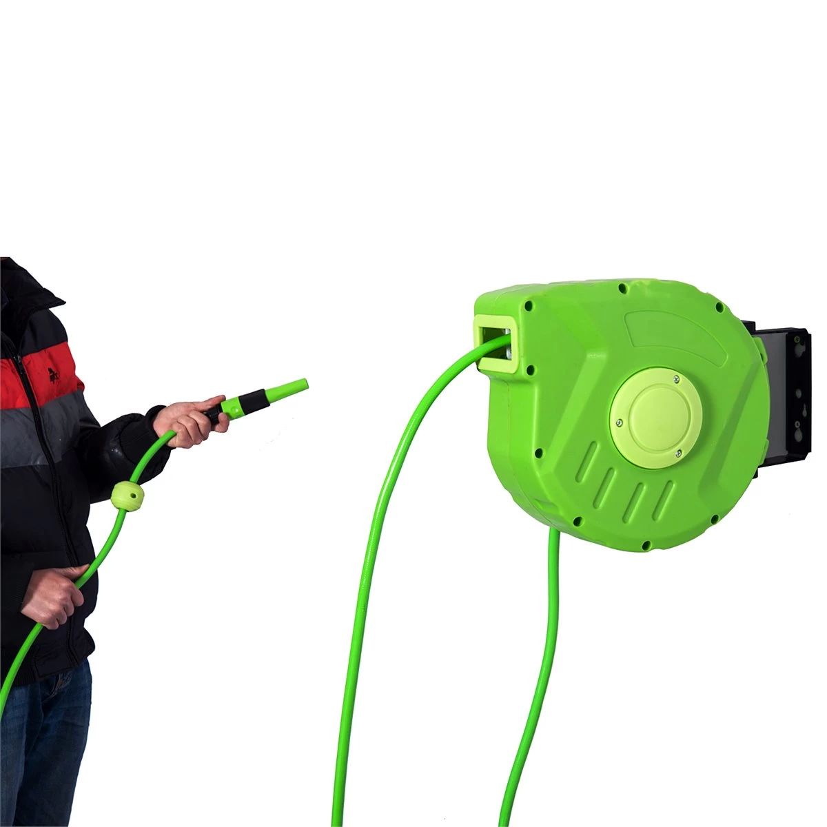 Este carrete para manguera tiene una gran variedad de aplicaciones domésticas: se puede usar para el riego de jardines y flores, para la limpieza del hogar y también para limpiar tus vehículos. Este dispositivo está fijado en la pared y utiliza una tubería de agua retráctil, muy estable y práctico. Permite una rotación de 180 grados, de modo que puede aumentar la cobertura de riego. Está hecho de materiales de alta calidad para garantizar el uso a largo plazo en exteriores. Se enrolla de forma fácil y automática sin ocupar espacio ¡Es una gran solución para evitar los nudos y el desorden de las mangueras tradicionales! Características – Carrete portamanguera muy útil con 10m de manguera y 1m de cable de conexión – Ideal para el riego de jardín, limpieza doméstica, limpieza de vehículos, etc. – La manguera se bloquea con una bola que puede fijarse en cualquier longitud – Ángulo de rotación de 180 ° que amplía la cobertura de riego y ahorra espacio cuando se pliega – La fijación de pared es fácil de desmontar para proteger el producto cuando no esté en uso – Se enrolla automáticamente de forma ordenada y compacta – Cubierta de PP de alta calidad y manguera de PVC que garantiza la máxima resistencia – Fijación estable en la pared. Accesorios de fijación incluidos Especificaciones – Color: Verde Material: PP, PVC – Longitud de la manguera: 10m Longitud del cable conductor de 1m – Presión del agua: 8bar Presión máxima del agua: 24bar Temperatura recomendada: -5-45℃ – Dimensiones del paquete: 35,5×11,5×27,5 cm (LxANxAL – Peso bruto: 3.65 kg Referencia: 845-181