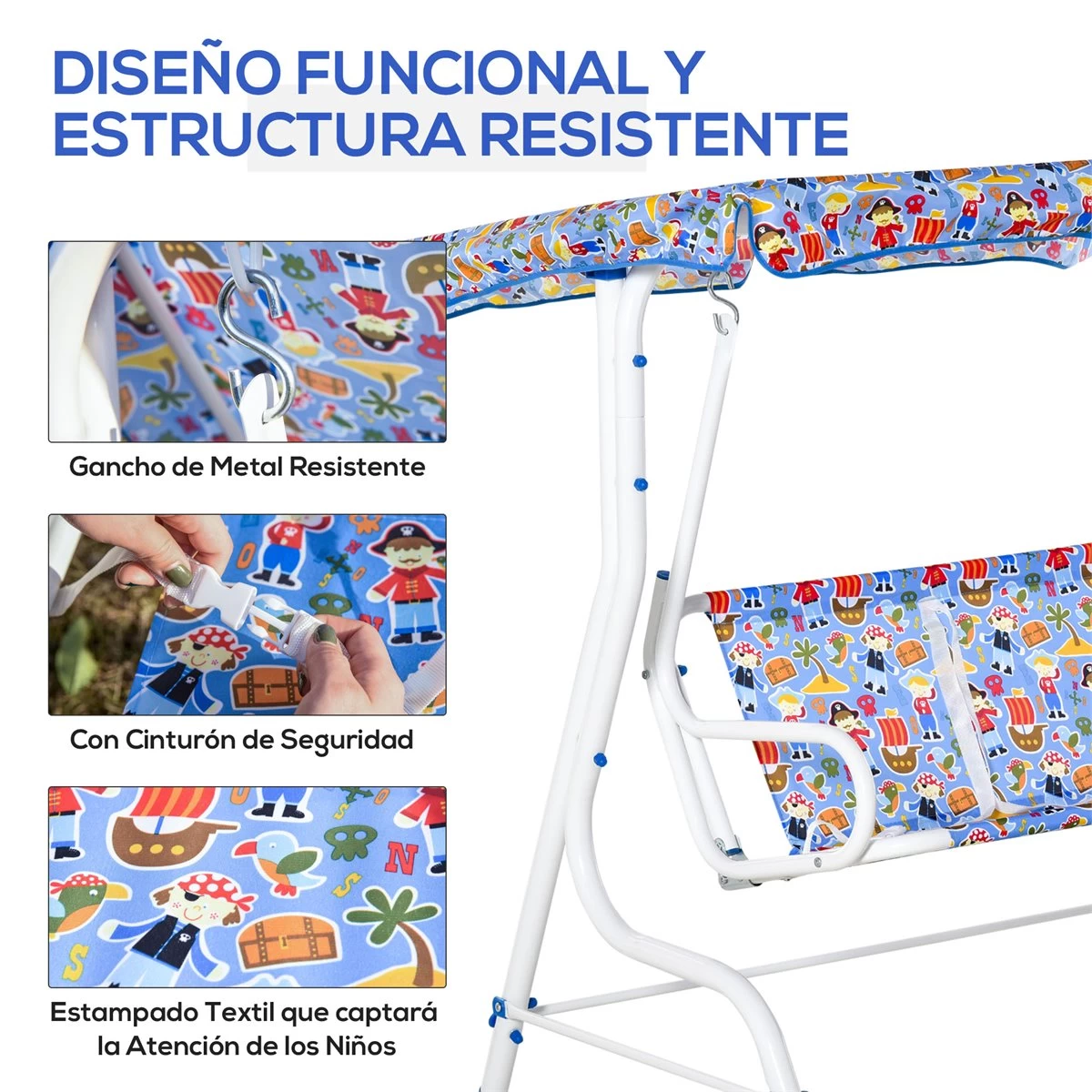 - – El colorido estampado del tejido del asiento y toldo de este columpio llamará la atención y despertará el interés de los más pequeños