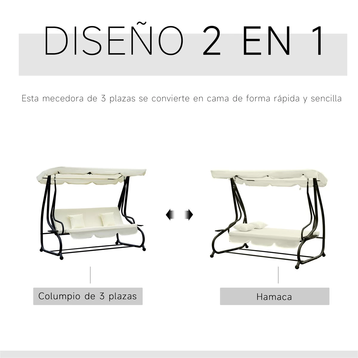 - – Diseño único: Columpio tipo balancín con respaldo que se convierte en cama o hamaca, ofreciendo así diferentes usos en el mismo producto. El techo es ajustable y desmontable para protegerse de los rayos del sol. – Alta calidad: El marco está hecho de acero, es grueso, robusto y tiene gran estabilidad. La cubierta está hecha de tela poliéster, es resistente a la suciedad y es fácil de limpiar. – Gran comodidad: El columpio balancín tiene 3 asientos con un amplio espacio para hasta 4 personas. El cojín del asiento y el respaldo están llenos de algodón suave. – Detalles prácticos: Los pies tienen la base de plástico antideslizante. Incluye dos bandejas para bebidas en ambos lados. – Es fácil de montar siguiendo las instrucciones que van incluidas. Dimensiones totales: 200x120x164cm (LxANxAL, dimensiones del asiento: 160x50cm (LxAN, altura del asiento (con cojín: 46cm, dimensiones de la cama: 160x98cm (LxAN, dimensiones de la bandeja: 15x25cm (LxAN. Capacidad máx. de carga: 340kg. Nota sobre el envío- Debido a su tamaño, este producto se envía en 2 o más cajas. Por motivos logísticos, es posible que no reciba todos los bultos al mismo momento.