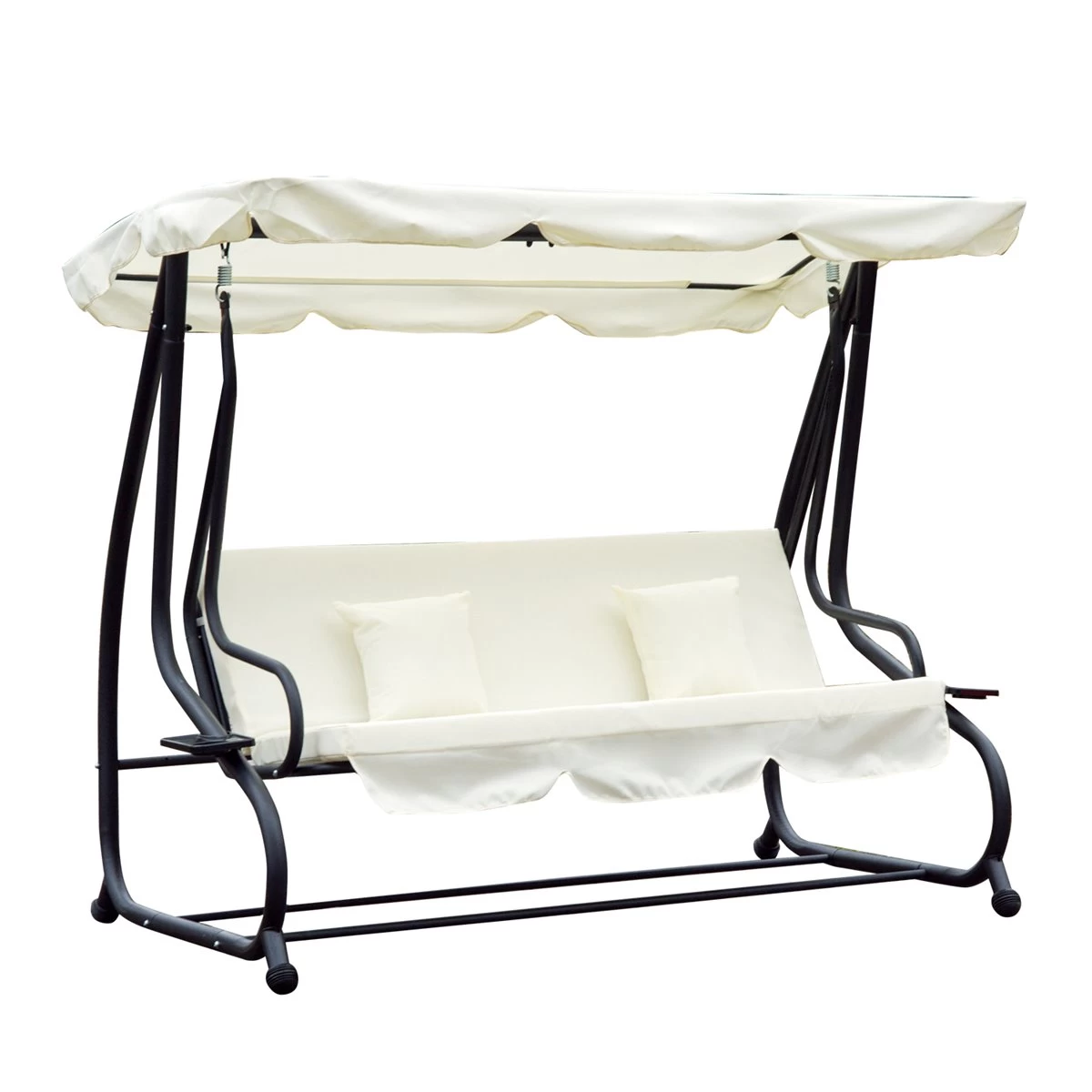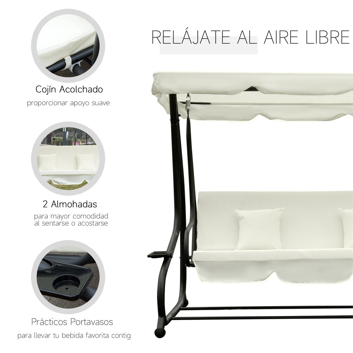 Disfruta de este cómodo y práctico columpio balancín en tu jardín o terraza. Tiene un espacioso asiento acolchado de 3 plazas y un techo regulable que te permite protegerte del sol. El respaldo es reclinable de modo que puedes tumbarte y disfrutar de una agradable siesta. Está hecho de materiales de alta calidad, duraderos y resistentes a la intemperie. Este columpio balancín es ideal para pasarlo bien en compañía de amigos y familiares.