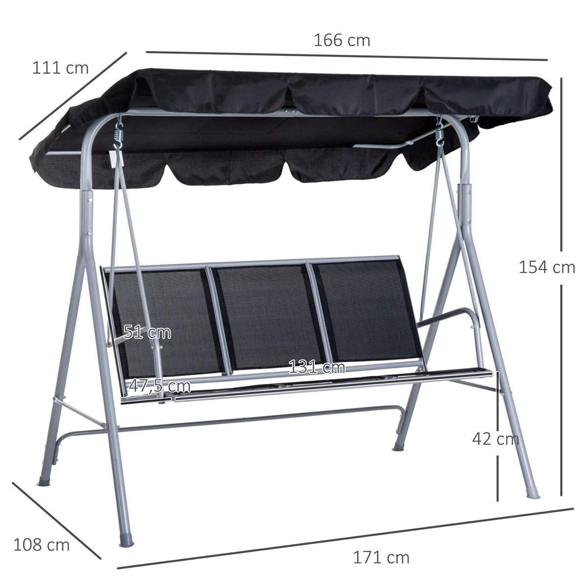 - – BALANCÍN DE 3 PLAZAS: Columpio de jardín elegante con toldo con faldón decorativo. Ideal para colocar en tu jardín, patio, terraza o cualquier otro espacio exterior y, disfrutar del tiempo libre con familiares y amigos – ESTRUCTURA RESISTENTE: Marco metálico en forma de «A» para una estabilidad uniforme, lacado con pintura con recubrimiento en polvo para mayor resistencia a la intemperie y a la corrosión. Las patas cuentan con pies antideslizantes para proteger el suelo de daños y rayones y añadir estabilidad al balancín de exterior – TOLDO RECLINABLE: El ángulo del toldo es ajustable, por lo que puedes ajustarlo de acuerdo con la incidencia de los rayos solares, o dirección del viento o lluvia ligera, por ejemplo. Es resistente a la intemperie, al agua y a los rayos UV – TEXTELINE TRANSPIRABLE: El cuerpo del asiento, hecho de texteline, es un tejido transpirable y con gran resistencia a las roturas, desgaste y decoloración. Además, es flexible y puede lavarse fácilmente con agua y jabón o con un paño húmedo – MEDIDAS TOTALES: 171x108x154 cm (LxANxAL. Medidas del asiento: 131×47,5×42 cm (LxANxAL. Peso máximo soportado: 240 kg. Requiere montaje