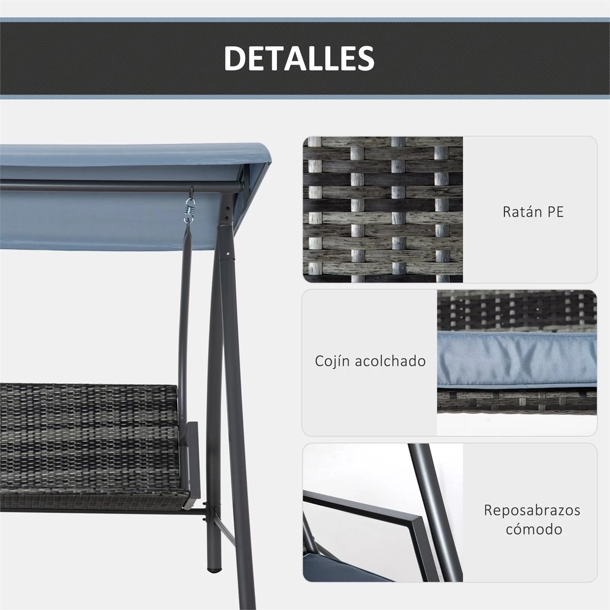 ¿Estás buscando un balancín para tu jardín, patio o terraza? Te presentamos este elegante columpio de ratán PE de Outsunny. Tiene capacidad para 3 personas y el asiento cuenta con un suave cojín acolchado para mayor comodidad. La estructura es de metal tubular resistente y muy estable. Y tiene un toldo reclinable para protegerte del sol. Podrás relajarte y disfrutar del día sentado en este fantástico columpio. También podrás balancearte y pasar grandes momentos con tus amigos.