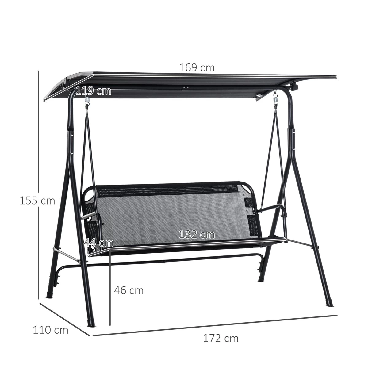 - – BALANCÍN DE DOS PLAZAS: Columpio de jardín elegante con toldo. Ideal para colocar en tu jardín, patio, terraza o cualquier otro espacio exterior y, disfrutar del tiempo libre con familiares y amigos – TOLDO RECLINABLE: El ángulo del toldo es ajustable, por lo que puedes ajustarlo de acuerdo con la incidencia de los rayos solares, o dirección del viento o lluvia ligera, por ejemplo – ESTRUCTURA RESISTENTE: Marco metálico en forma de «A» para una estabilidad uniforme, lacado en color negro con pintura con recubrimiento en polvo para mayor resistencia a la intemperie y a la corrosión. Las patas cuentan con pies antideslizantes para proteger el suelo de daños y rayones y añadir estabilidad al conjunto – TEXTELINE TRANSPIRABLE: El cuerpo del asiento, hecho de texteline, es un tejido transpirable y con gran resistencia a las roturas, desgaste y decoloración. Además, es flexible y puede lavarse fácilmente con agua y jabón o con un paño húmedo – MEDIDAS TOTALES: 172x110x155 cm (LxANxAL; Medida del asiento: 132x44x46 cm (LxANxAL; Peso máximo soportado: 200 kg