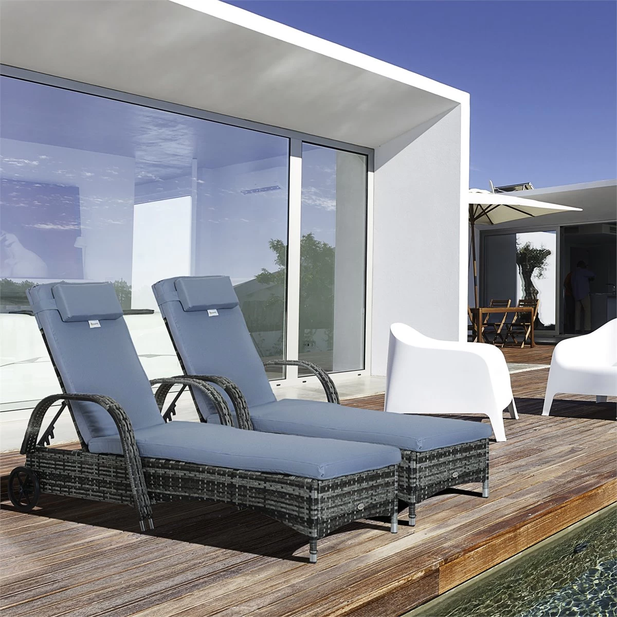 Este conjunto de 2 tumbonas para exterior de Outsuuny tiene una estructura de metal galvanizado cubierta con poliratán, con gran resistencia a la intemperie y a los rayos UV. Su respaldo tiene 5 posiciones ajustables para que puedas sentarte a leer un libro o tumbarte a tomar el sol. Viene con el cojín de cuerpo entero incluido y uno para la cabeza. Además, tiene 2 ruedas en la parte del respaldo para mover con facilidad. Características – Tumbona con estructura metálica robusta y resistente a la intemperie y a la corrosión – Fabricada con poliratán PE, duradero y resistente a los rayos UV – Las 5 posiciones reclinables del respaldo permiten sentarte, tumbarte o acostarte – Con apoyabrazos laterales, para mayor alivio de tensión en espalda y hombros – Con dos ruedas en la parte posterior para mover y transportar con facilidad – Requiere montaje Especificaciones – Color: gris mixto (tumbona y gris (cojín – Material: ratán PE, metal, PE, tejido de poliéster y caucho – Medidas totales: 200x73x72-103 cm (LxANxAL – Medidas del respaldo: 50×79 cm (LxAL – Medidas del asiento: 57×120 cm (LxAN – Altura del asiento al suelo: 30 cm – Ancho del reposabrazos: 8 cm – Medidas del cojín reposacabezas: 37x17x5 cm (LxANxAL – Carga máxima: 160 kg – Certificaciones: EN581-1-2 – Referencia: 862-P007