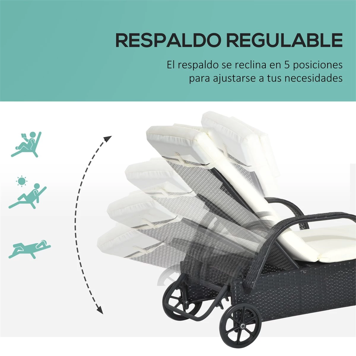Este conjunto de 2 tumbonas para exterior de Outsuuny tiene una estructura de metal galvanizado cubierta con poliratán, con gran resistencia a la intemperie y a los rayos UV. Su respaldo tiene 5 posiciones ajustables para que puedas sentarte a leer un libro o tumbarte a tomar el sol. Viene con el cojín de cuerpo entero incluido y uno para la cabeza. Además, tiene 2 ruedas en la parte del respaldo para mover con facilidad. Características – Tumbona con estructura metálica robusta y resistente a la intemperie y a la corrosión – Fabricada con poliratán PE, duradero y resistente a los rayos UV – Las 5 posiciones reclinables del respaldo permiten sentarte, tumbarte o acostarte – Con apoyabrazos laterales, para mayor alivio de tensión en espalda y hombros – Con dos ruedas en la parte posterior para mover y transportar con facilidad – Requiere montaje Especificaciones – Color: negro (tumbona y crema (cojín – Material: ratán PE, metal, PE, poliéster y caucho – Medidas totales: 200x73x56/103 cm (LxANxAL – Medidas del respaldo: 50×79 cm (LxAN – Medidas del asiento: 57×120 cm (LxAN – Altura del asiento al suelo: 30 cm – Ancho del reposabrazos: 8 cm – Medidas del cojín reposacabezas: 37x17x5 cm (LxANxAL – Carga máxima: 160 kg – Certificaciones: EN581-1-2 – Referencia: 862-P008