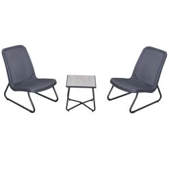 Si dispones de poco espacio en tu terraza o balcón no te preocupes. Este conjunto de 3 pieza de Outsunny es moderno, elegante y no tiene nada que envidiar a otros conjuntos más grandes. Cuenta con dos sillas y una mesa de centro cuadrada con estructura metálica. Las sillas tienen el cuerpo del asiento de resina imitación ratán. Y la mesa cuenta con una fantástica encimera de vidrio templado con el efecto marmolado que está tanto de moda ¡Un conjunto bonito y funcional! Características – Perfecto para jardines, patios, porches, balcones y más – Amplios asientos de resina PP efecto ratán natural – Mesa de centro para colocar bebidas, libros y otros artículos de uso diario – Encimera de diseño chic y elegante de vidrio templado con vetas efecto mármol – Las 3 piezas cuentan con protecciones de caucho para preservar los muebles y no dañar el suelo – Las protecciones de la mesa son ajustables Especificaciones – Color: gris y negro – Material: metal, vidrio templado y PP – Medidas totales: 53,5×80,5×76 cm (LxANxAL – Medidas de la mesa de centro: 42x42x41 cm (LXANxAL – Medidas del asiento: 53,5x51x36,5 cm (LxANxAL – Medidas del respaldo: 60×48 cm (LxAN – Carga máxima: 150 kg (cada silla y 50 kg (mesa – Certificaciones: EN581-1-2 (silla y EN 12520 (vidrio templado – Referencia: 84B-611