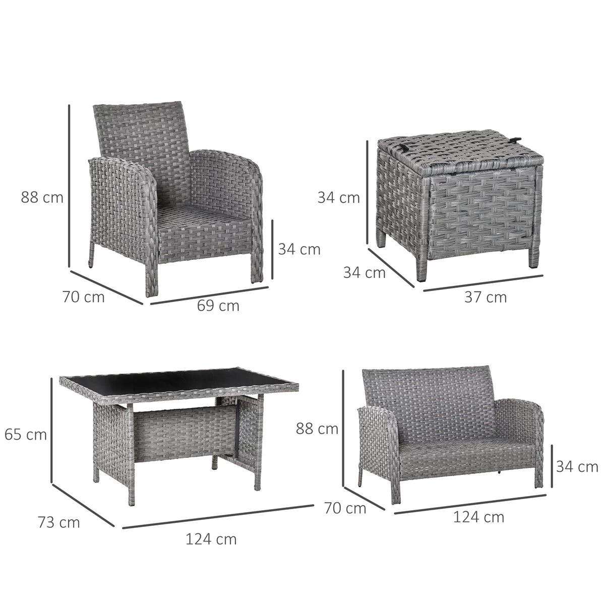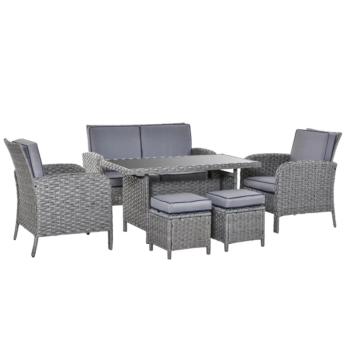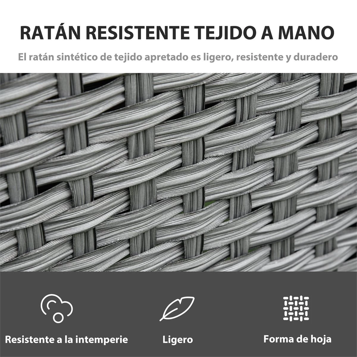 Si buscas un conjunto de muebles de jardín funcional, este de Outsunny cumplirá tus expectativas. Con estructura metálica y tapizado en ratán sintético, está compuesto por una amplia mesa con encimera de cristal templado, un sofá doble, 2 sillones individuales y dos taburetes. Incluye cojines para los asientos y respaldos con fundas con cremallera, extraíbles y lavables. La altura de la mesa es ideal para comer en ella y tiene capacidad para 6 personas. Características – Conjunto de muebles de jardín de ratán compuesto por: 1 mesa, 1 sofá doble, 2 sillones individuales y 2 taburetes – Estructura metálica y tapicería de ratán sintético – Cojines acolchados para asientos y respaldos – Fundas d ellos cojines con cremallera, extraíbles y lavables – Mesa de jardín con encimera de cristal templado – Ideal para jardín, patio, terraza o cualquier otro espacio exterior – Se requiere montaje Especificaciones – Color: gris – Material: metal, ratán PE y poliéster – Medidas del sofá doble: 124x70x88 cm (LxANxAL – Medidas de los sillones: 69x70x88 cm (LxANxAL – Medidas de la mesa: 124x73x65 cm (LxANxAL – Medidas de los taburetes: 37x34x34 cm (LxANxAL – Altura del asiento del sofá: 34 cm – Espesor de los cojines: 7,5 cm – Carga máxima: 320 kg (sofá doble, 160 kg (sillón individual, 100 kg (taburete y 70 kg (mesa – Certificaciones: EN581-1.2 – Referencia: 860-136