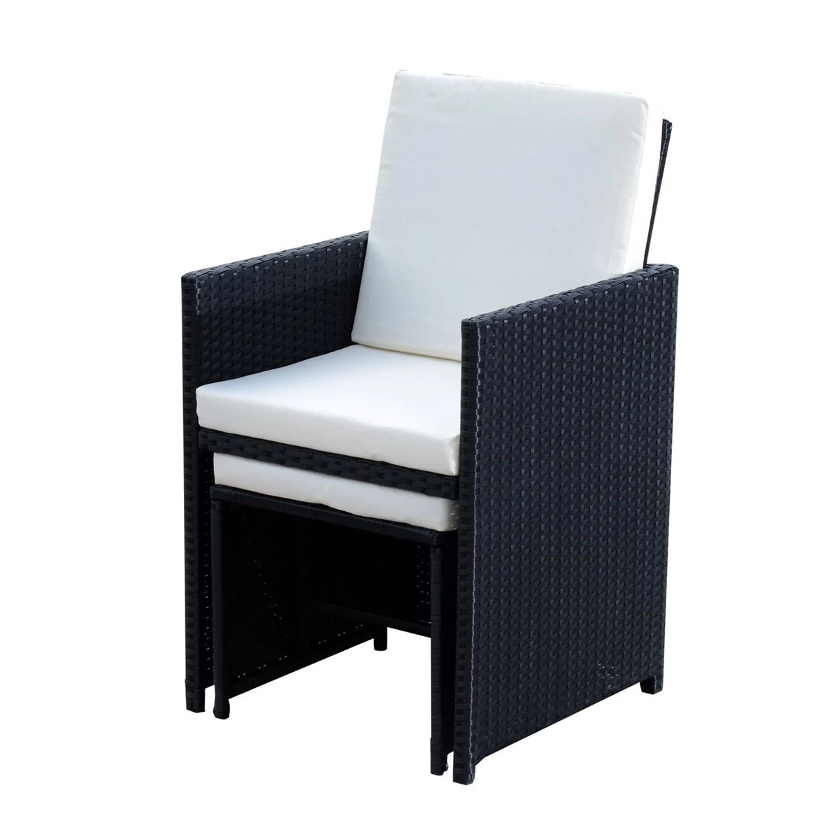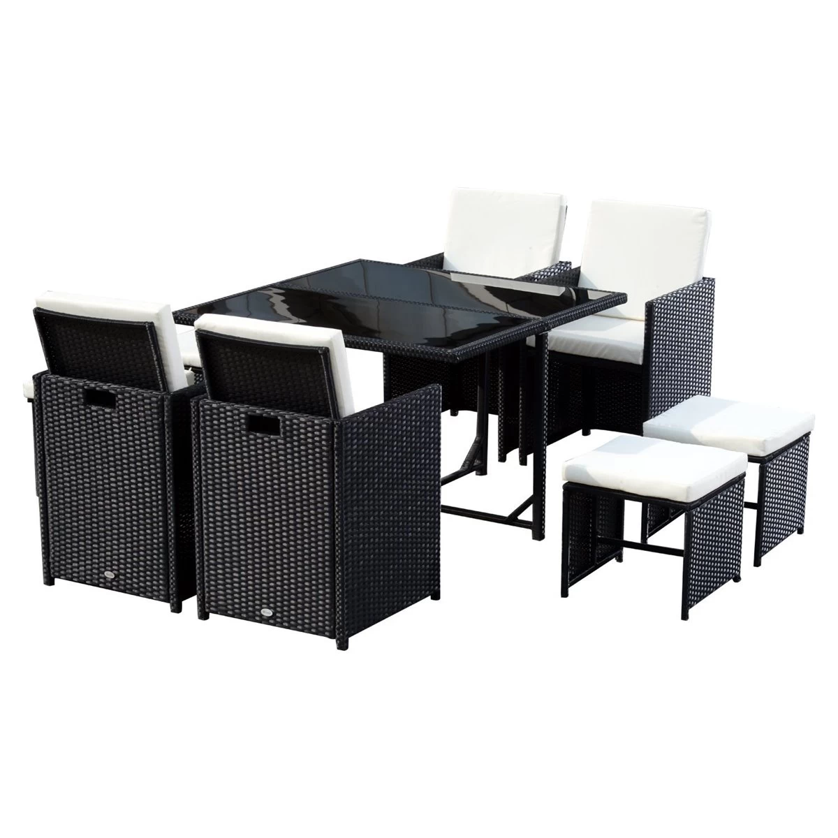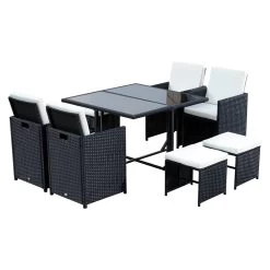 ¿Estás buscando muebles para tu jardín o terraza? Presentamos un conjunto de muebles de exterior clásico y elegante de poliratán. El conjunto tiene 9 piezas: 1 mesa, 4 sillas y 4 taburetes con cojín suave, grueso y lavable. El poliratán es una alternativa al ratán natural pero más resistente y apto para la intemperie. Los taburetes se pueden meter bajo las sillas y estas se esconden debajo de la mesa para ahorrar espacio. Estos muebles de jardín son muy prácticos y decorativos. Características – Conjunto de 9 piezas: 1 mesa de vidrio templado, 4 sillas y 4 taburetes con cojín suave – Adecuado para jardín, terraza, balcón, etc. – Fabricado en ratán de polietileno que asegura un largo uso – Mesa de comedor con almohadillas ajustables para los pies que pueden proteger el piso y agregar más estabilidad en terrenos irregulares – Su especial diseño permite que los taburetes se pueden meter bajo las sillas y las sillas se esconden bajo la mesa fácilmente para ahorrar espacio – Estructura robusta de tubo de metal galvanizado – Cojín cubierto por tela de poliéster lavable relleno de algodón suave de grosor 5 cm Especificaciones – Color: negro y blanco – Material: ratán PE, metal galvanizado, poliéster y vidrio templado – Medidas de la mesa: 109x109x72 cm (LxANxA – Medidas de la silla: 56x52x87 cm (LxANxA – Medidas del taburete: 41x41x35 cm (LxANxA – Capacidad de carga: (silla 120 kg, (taburete 60 kg, (mesa 50 kg – Referencia: 841-105