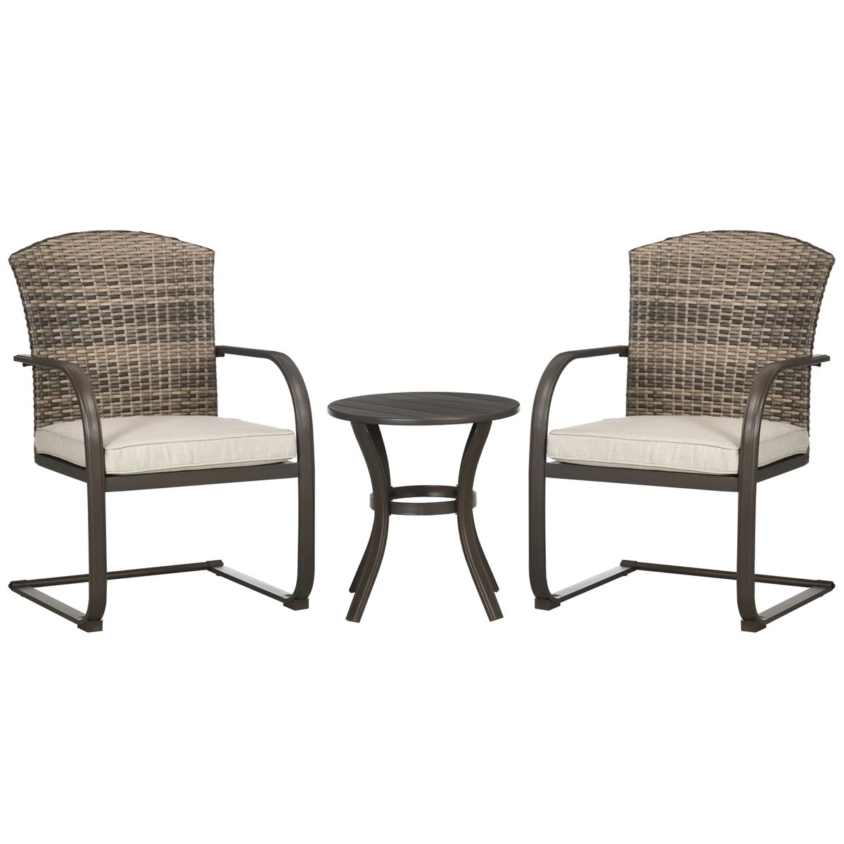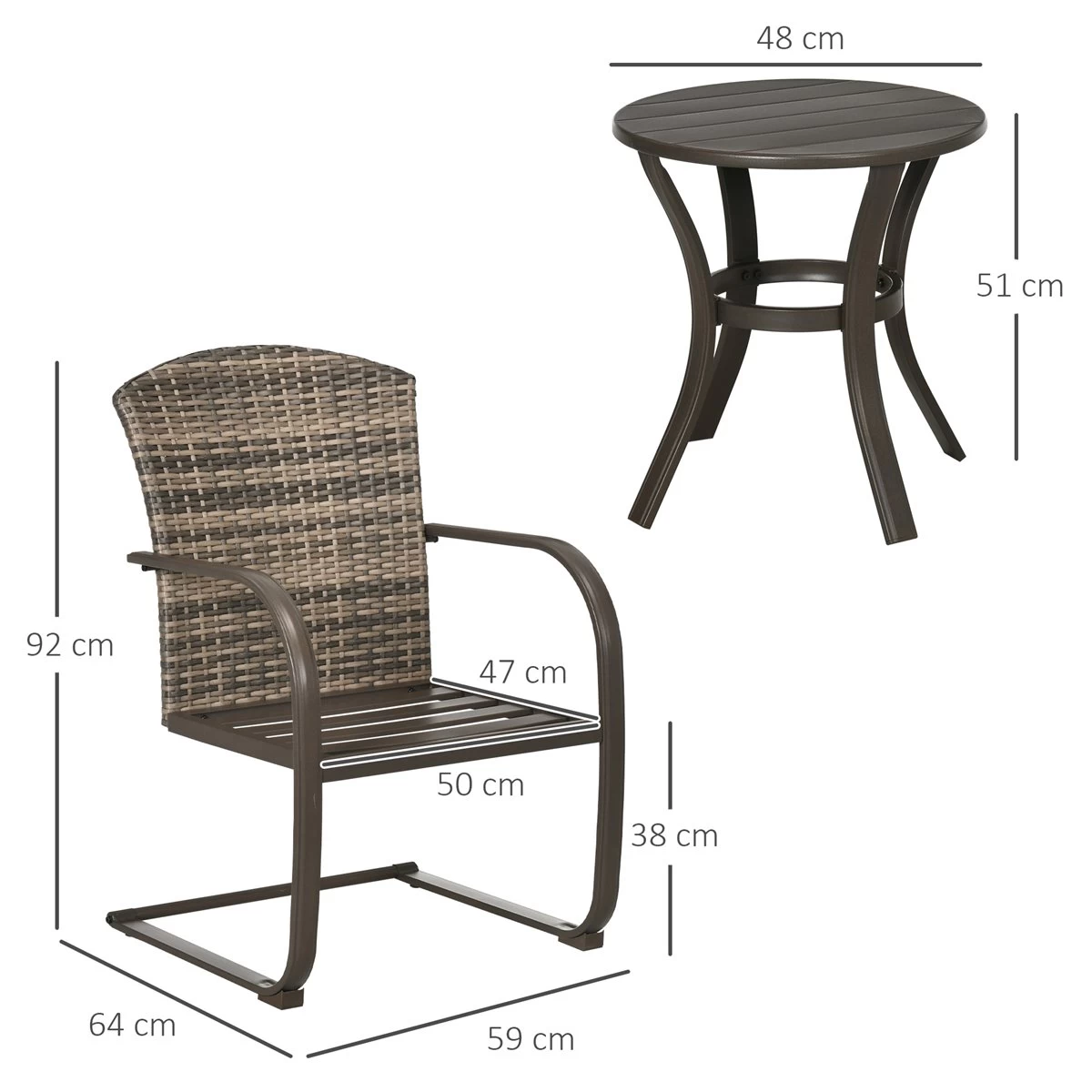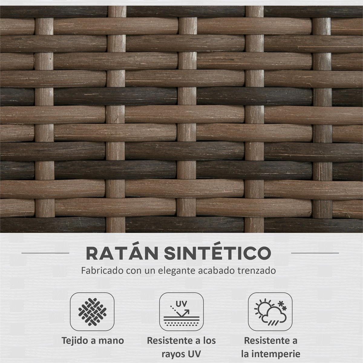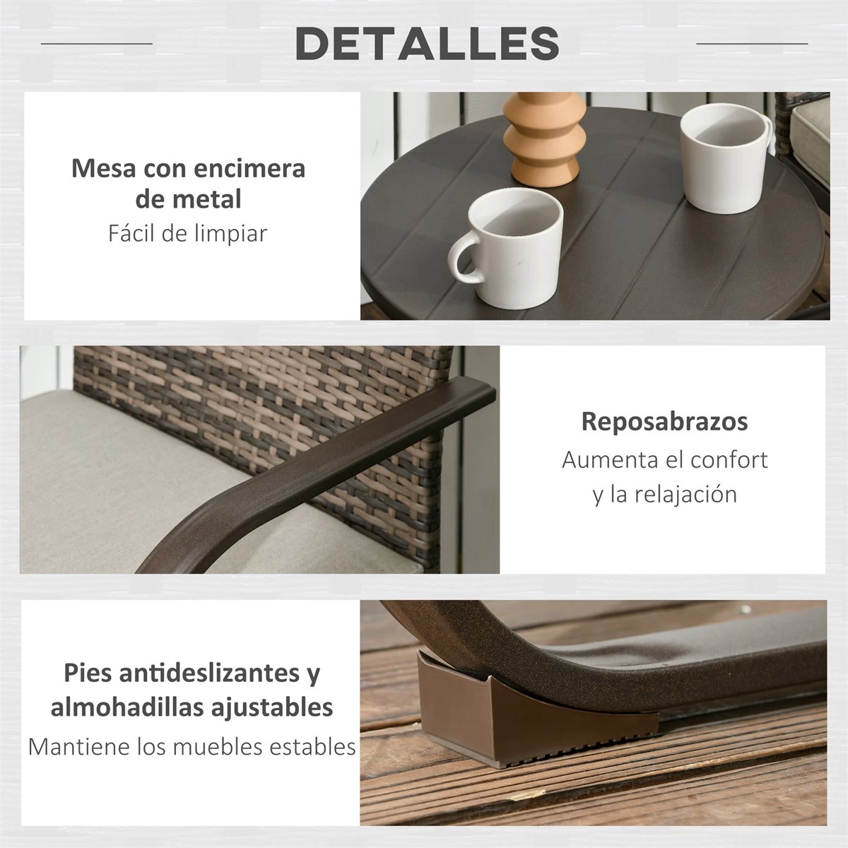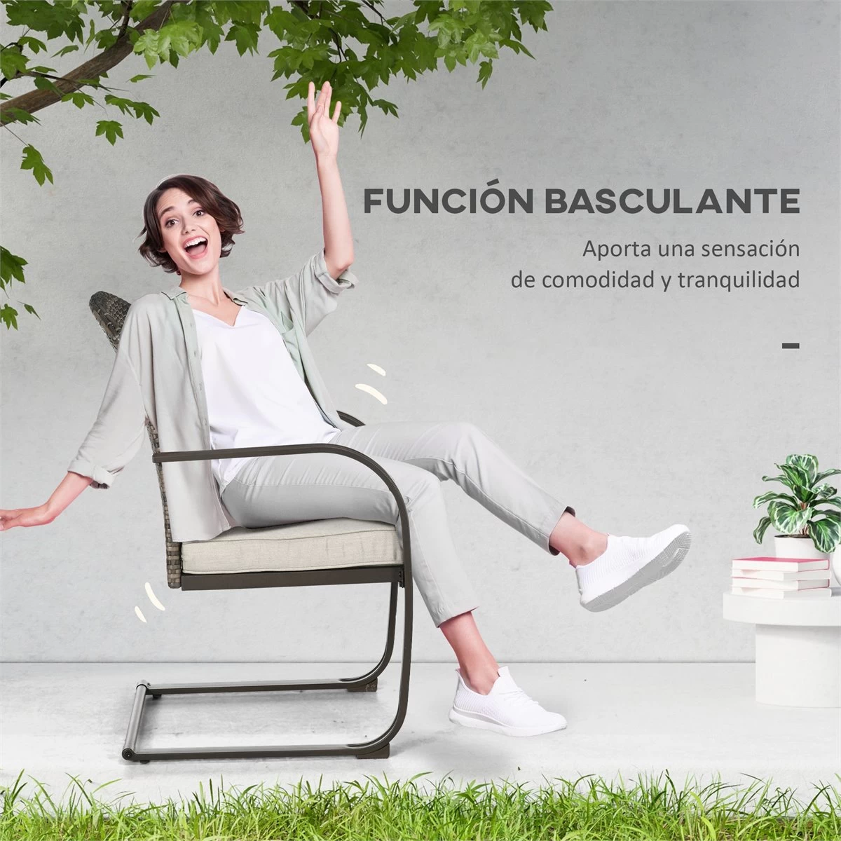 Este conjunto de jardín de Outsunny puede ser una buena opción para disfrutar de momentos de relax en tu terraza. Compuesto por 2 sillones con función basculante y 1 mesa, este moderno conjunto de jardín de ratán sintético es ideal para disfrutar de una agradable tarde con amigos o familia. Con marco de acero y recubierto de ratán PE, es resistente, estable e ideal para un uso prolongado. Es el conjunto de muebles perfecto para disfrutar de horas de ocio al aire libre. Características – Este juego de exterior está compuesto por una mesa y dos sillones – El marco está hecho de acero con recubierto en polvo y está envuelto con PE rattán para asegurar su estabilidad – Los cojines son suaves para mayor comodidad y las fundas de los cojines se pueden quitar fácilmente para ser lavadas – El rattán tejido a mano le dará un toque estético a tu espacio exterior – Las patas cuentan con almohadillas ajustables para garantizar su estabilidad en todo momento y no rayar el suelo – Los sillones tienen una función basculante, por lo que puede inclinarse hacia adelante y hacia atrás y disfrutar de una sensación de relajación – Este conjunto puede ser montado por una sola persona, en un tiempo aproximado de 2 horas – Se requiere montaje Especificaciones – Color: marrón mixto, caqui – Material: acero, poliéster, ratán PE – Medidas de la mesa: Ø48×51 cm (DxAL – Medidas de los sillones: 59x64x92 cm (LxANxAL – Medidas del asiento: 50×47 cm (LxAN – Altura del asiento (sin cojín: 38 cm – Medidas del respaldo: 60×59 cm (LxAN – Grosor del cojín del asiento: 8 cm – Carga máxima: 120 kg (silla, 15 kg (mesa – Referencia: 863-118V00MB