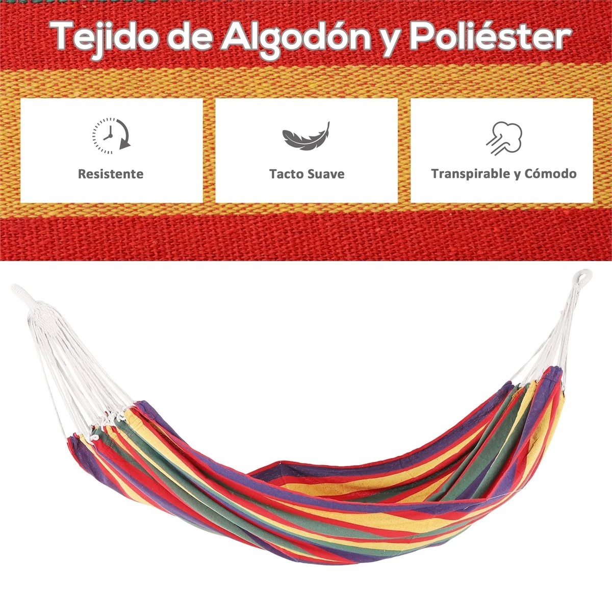 ¿Has visto esta hamaca de rayas multicolores de Outsunny? Ideal para disfrutar de una tarde tomando el sol o relajarte con un buen libro a la sombra de los árboles o en un soporte para hamacas (no incluido. Confeccionada en tela de algodón 100% con fuertes nudos de cuerda a cada lado, soporta hasta 120 kg y es lavable a 30ºC. Características – Hamaca de diseño moderno y actual con estampado de rayas multicolores – Tejido de algodón 100% para mayor comodidad y absorción de la humedad – Hamaca espaciosa ideal para descansar, leer o echar una siesta al aire libre – Para uso interior y exterior, apta para llevar de acampada, al camping o cualquier otro espacio al aire libre o que cuente con un soporte para su colocación – Fácil de instalar y como es plegable también podrás guardarla fácilmente en cualquier lugar – Este producto incluye solo el tejido de la hamaca, NO incluye soporte, ganchos ni cuerdas de fijación – Tejido resistente y lavable a 30°C – Consejo: Tumbarse en diagonal para una mejor postura de la espalda Especificaciones – Color: rayas multicolor – Material: 100% algodón – Medidas de la tela: 200×100 cm (LxAN – Longitud total: 2,9 m – Peso máximo soportado: 120 kg – Referencia: 100110-081 – Nota: La etiqueta de este producto presenta un error, poniendo que el peso máximo es 105kg/230lbs, cuando en realidad es 120kg/330lbs