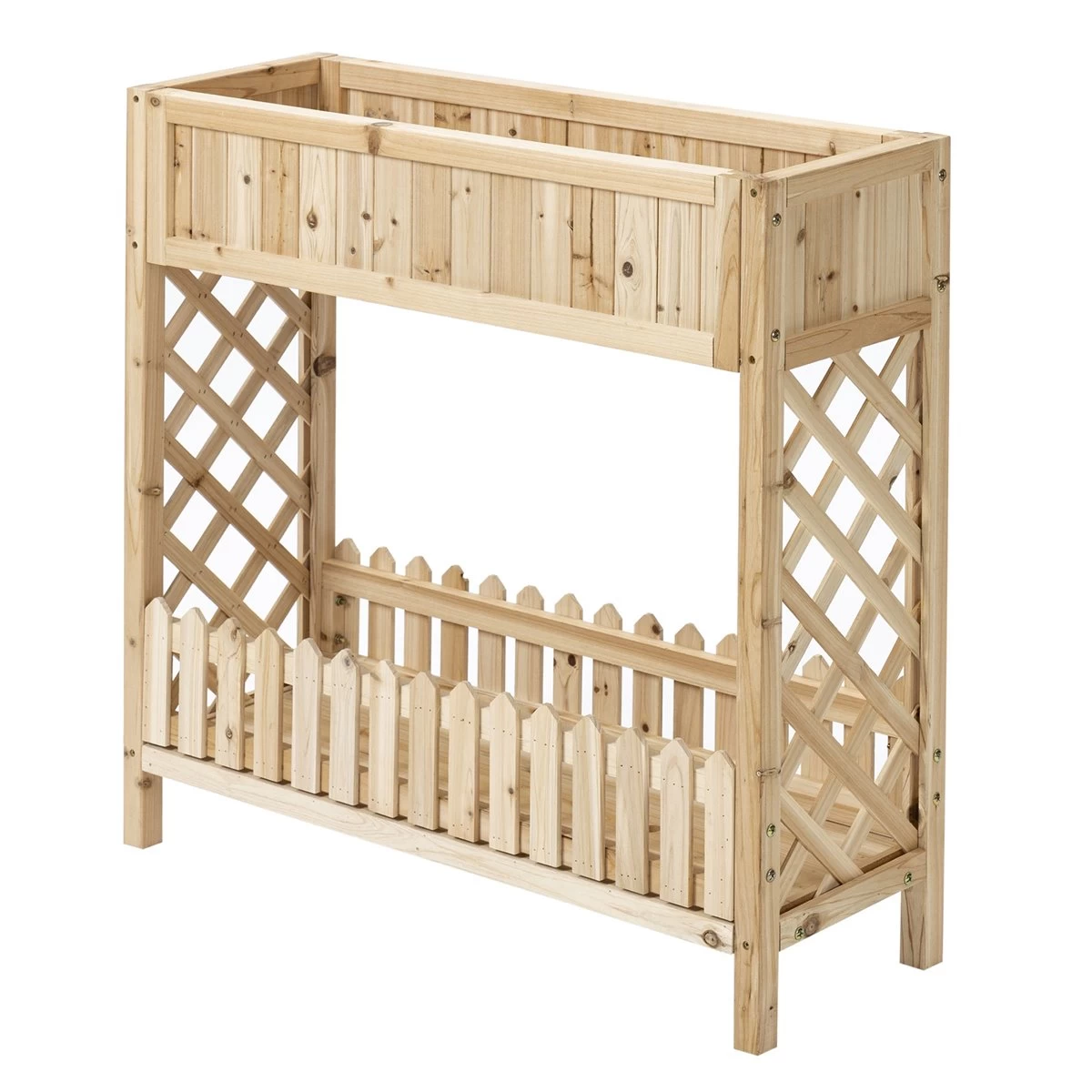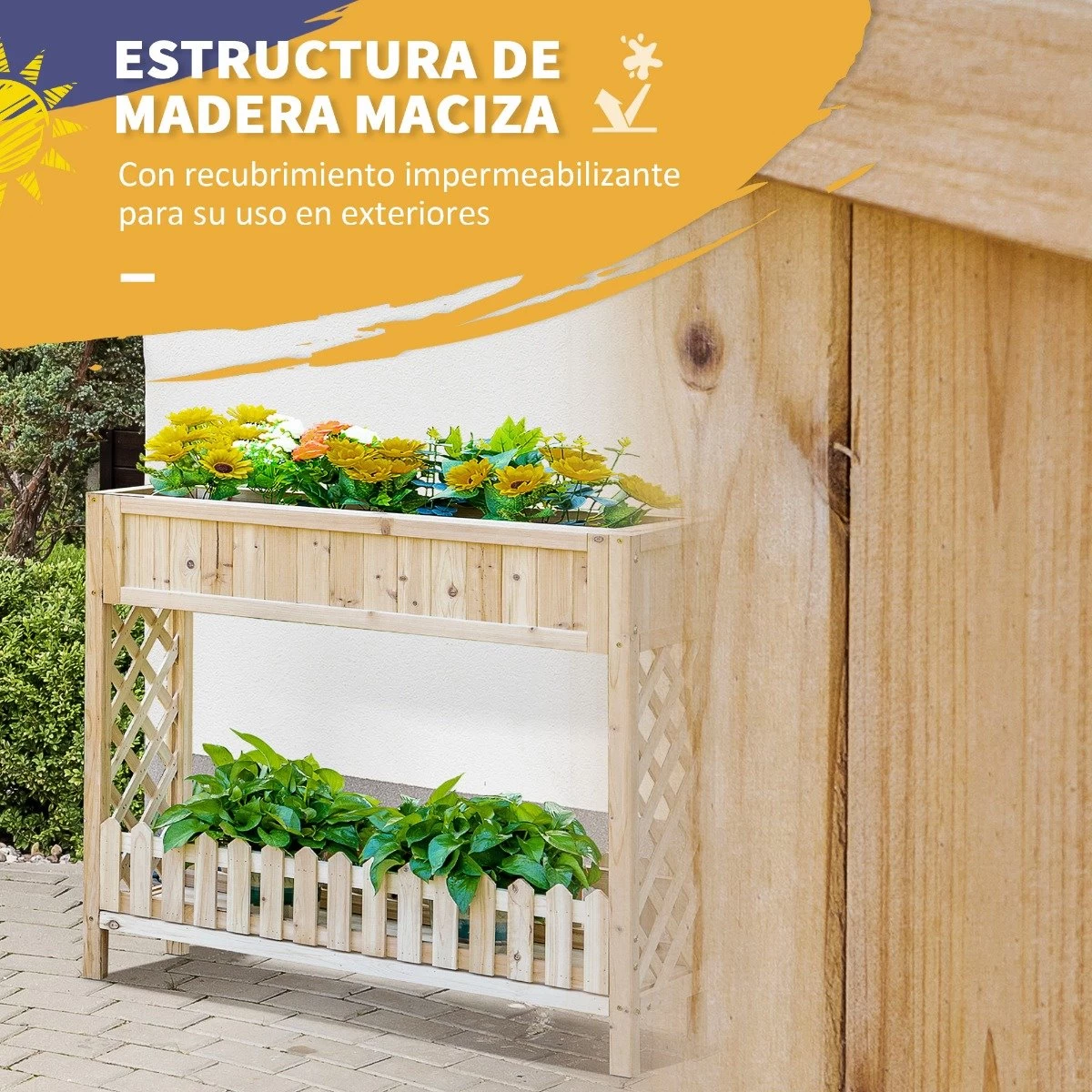 - – DISEÑO EN 2 NIVELES: Este huerto vertical elevado con un diseño elegante y decorativo es ideal para cualquier espacio. Tiene 2 niveles, siendo el primero perfecto para cultivar tus flores, verduras, hierbas, etc. mientras que el estante inferior es ideal para guardar sus herramientas de jardinería – ALTURA ADECUADA: Esta jardinera es ideal para quienes tienen dificultades para agacharse o inclinarse, o simplemente no quieren hacerlo. Reduce la tensión de la espalda y las rodillas y también ayuda a proteger las plantas de los roedores o plagas – RESISTENTE Y DECORATIVA: Fabricada en madera de abeto y con tratamiento impermeabilizante, es ideal para exteriores. Tiene un diseño de celosía y valla decorativa que le dará un toque de elegancia allá donde la coloques – BUEN DRENAJE: Este huerto tiene 4 agujeros de drenaje en la parte inferior. Ideal para la transpiración y para evitar la acumulación de agua – MEDIDAS TOTALES: 90x30x90 cm (LxANxAL. Medidas del área de cultivo: 83,5x24x17 cm (LxANxAL. Peso máximo soportado: 75 kg (área de plantación y 25 kg (estante. Requiere montaje