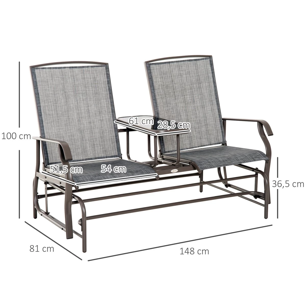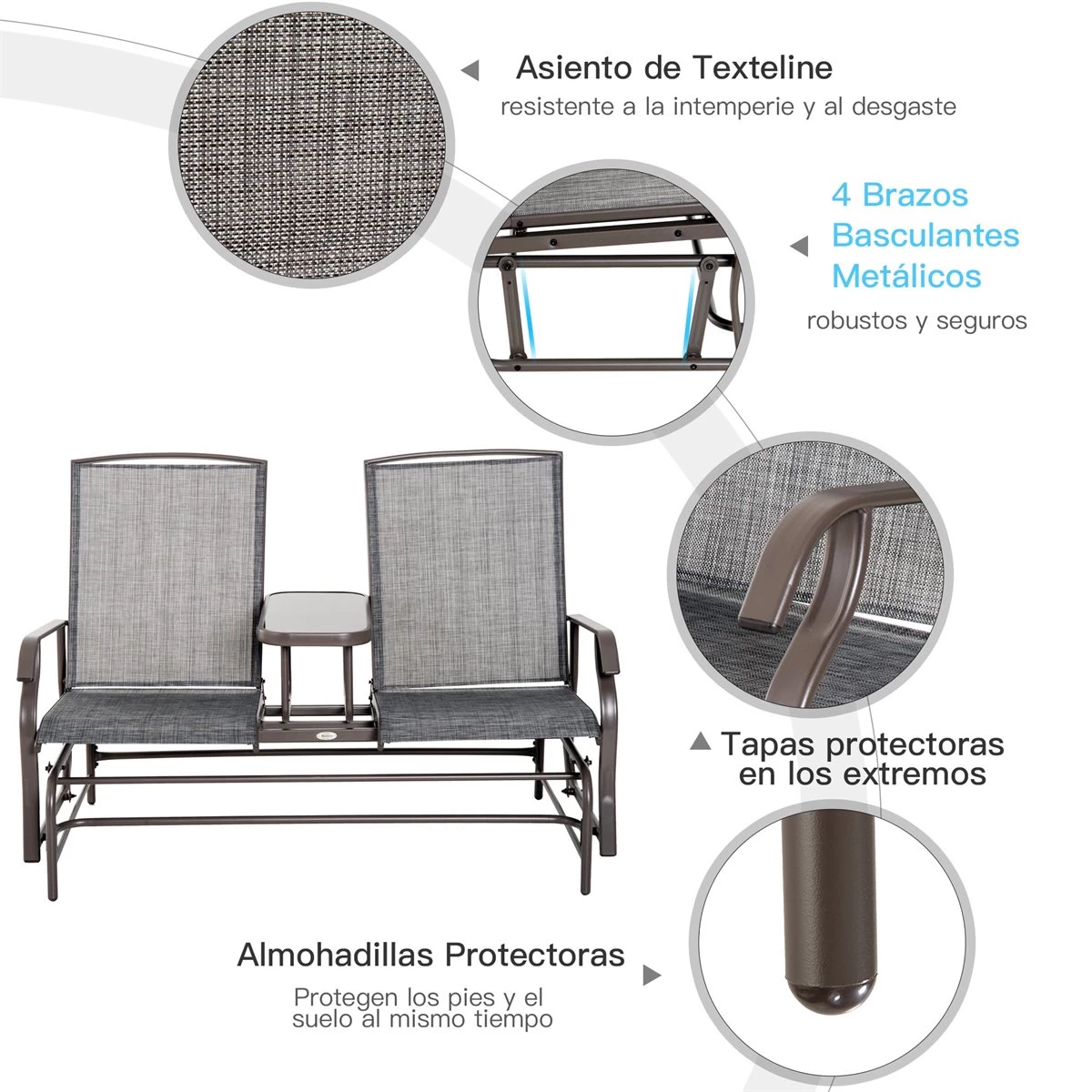 - – BANCO BALANCÍN DE 2 PLAZAS: Esta elegante mecedora de 2 plazas te permite disfrutar del sol en tu jardín, terraza, patio o junto a la piscina. Es un mueble perfecto que aportará un toque de elegancia allá donde lo coloques – BASCULANTE: Conectados a la estructura principal mediante los apoyabrazos, este banco con 2 asientos cuenta con función basculante para que puedas columpiarte fácilmente hacia adelante y atrás mientras descansas y te relajas – CON MESA INCLUIDA: Este balancín de jardín cuenta con una mesa central con encimera de vidrio templado fácil de limpiar, para que puedas tener un espacio donde colocar tu bebida, tentempié, libre, móvil, etc. – RESISTENTE: Este banco para exterior tiene una estructura robusta de metal y la base de los asientos y respaldos de cómoda tela de texteline transpirable. Ambos elementos combinados, ofrecen una gran capacidad de carga, soportando un peso de 165kg cada uno de los asientos – MEDIDAS TOTALES: 148x81x100 cm (LxANxAL; Medidas de los asientos: 54×51,5 cm (LxAN