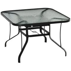 ¿Estás preparando tu terraza o jardín para la llegada del buen tiempo? Entonces esta mesa de jardín cuadrada de Outsunny con encimera de cristal te encantará. Conjúntala junto a tus sillas si ya tienes o hazte con unas te gusten. Combinarlas con la mesa será tarea fácil, ya que su estructura de acero de color negro y la encimera de cristal templado ondulado combinan con casi cualquier cosa. Además, tiene un agujero para que puedas poner en medio la sombrilla. Características – Encimera de vidrio templado grueso para mayor seguridad – Superficie de la encimera con fino relieve de ondas de agua que recuerdan el movimiento del mar – Estructura de acero curvado con bordes redondeados – Con un orificio en el medio apto para sombrillas con postes de 38 mm de diámetro – Ideal para su uso en exteriores como jardín, patio o terraza – Se limpia fácilmente con un paño húmedo – Con gran capacidad de carga, puede soportar hasta 45 kg – Requiere montaje Especificaciones – Color: negro – Material: acero y vidrio templado – Medidas totales: 106,5×106,5×71 cm (LxANxAL – Diámetro del orificio para la sombrilla: Ø38 mm – Carga máxima: 45 kg – Referencia: 84B-774