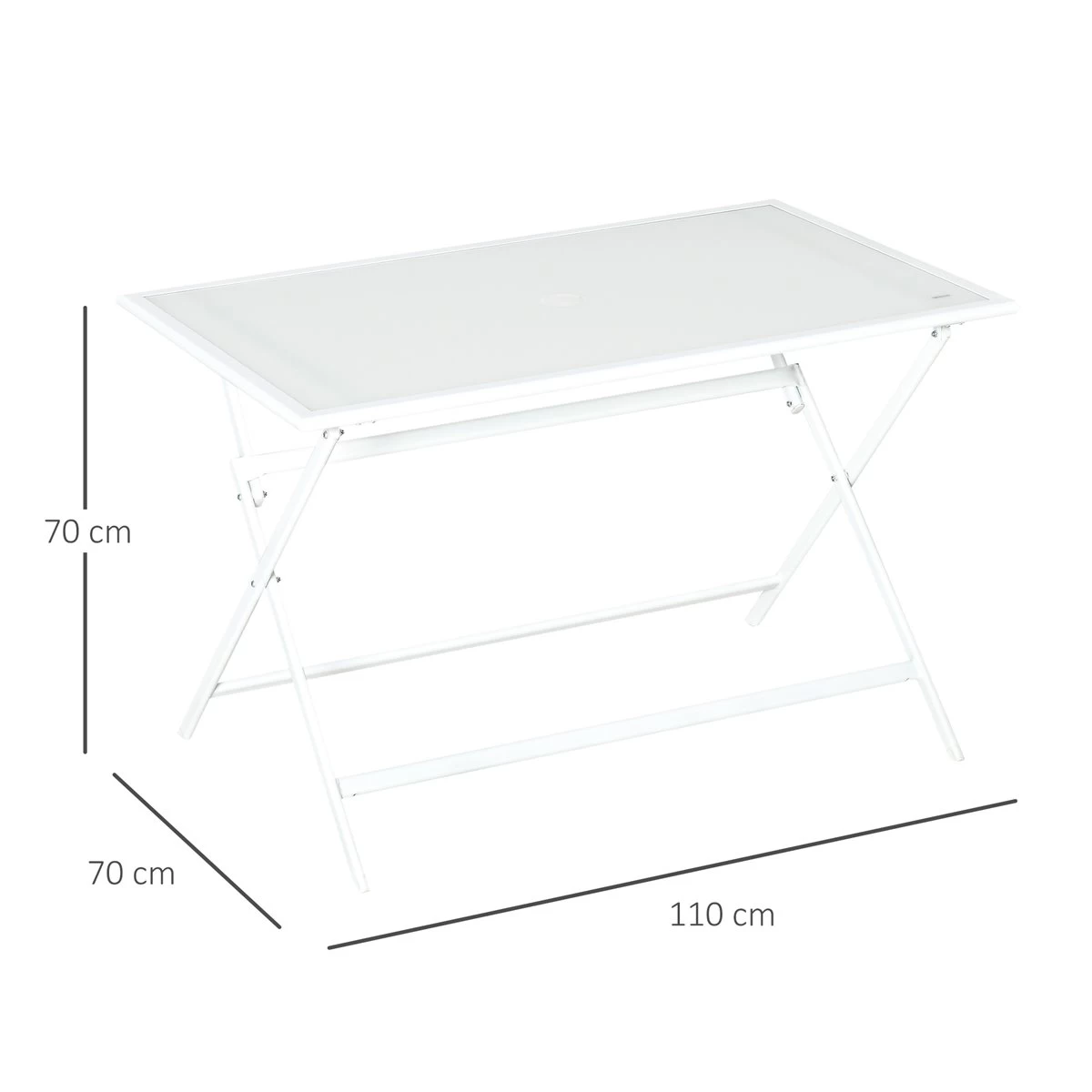 - – DISEÑO COMPACTO: Esta mesa de comedor exterior tiene un diseño plegable por lo que es ideal para facilitar su transporte y almacenaje cuando no vayas a usarla. No requiere montaje, tan solo tendrás que desplegarla y ya estará lista para usar – MESA CON ORIFICIO PARA SOMBRILLA: Esta mesa rectangular de exterior tiene un agujero en el centro para poder instalar un parasol con mástil de diámetro de 38 mm y 48 mm. Para que puedas disfrutar de una comida al aire libre sin que te molesten los rayos directos del sol – ENCIMERA DE VIDRIO TEMPLADO: Esta mesa de picnic cuenta con una resistente encimera de vidrio templado de 5 mm de grosor. Esta masa de balcón añadirá un toque de elegancia allá donde la coloques. Además, es fácil de limpiar con un paño húmedo – ESTRUCTURA RESISTENTE: Hecha con un marco de metal resistente con recubrimiento en polvo, para garantizar una buena resistencia a la intemperie y a la oxidación. Cuenta con almohadillas protectoras antideslizantes en las patas para mayor estabilidad y adherencia al suelo, y para no rayarlo – MEDIDAS TOTALES: 110x70x70 cm (LxANxAL. Medidas plegadas: 110x97x7 cm (LxANxAL. Peso máximo soportado: 30 kg