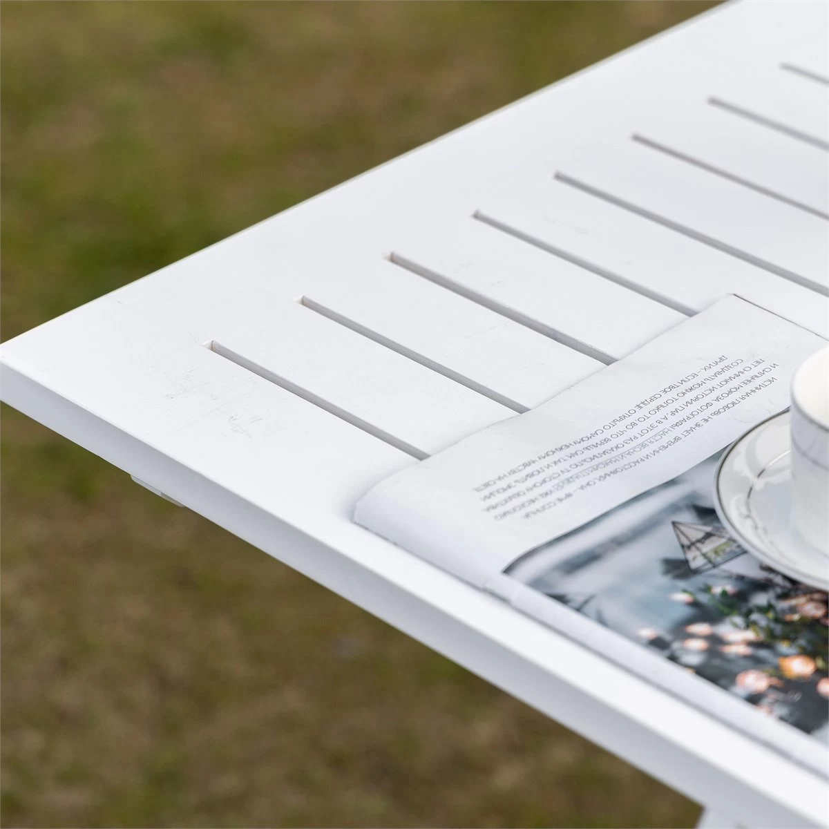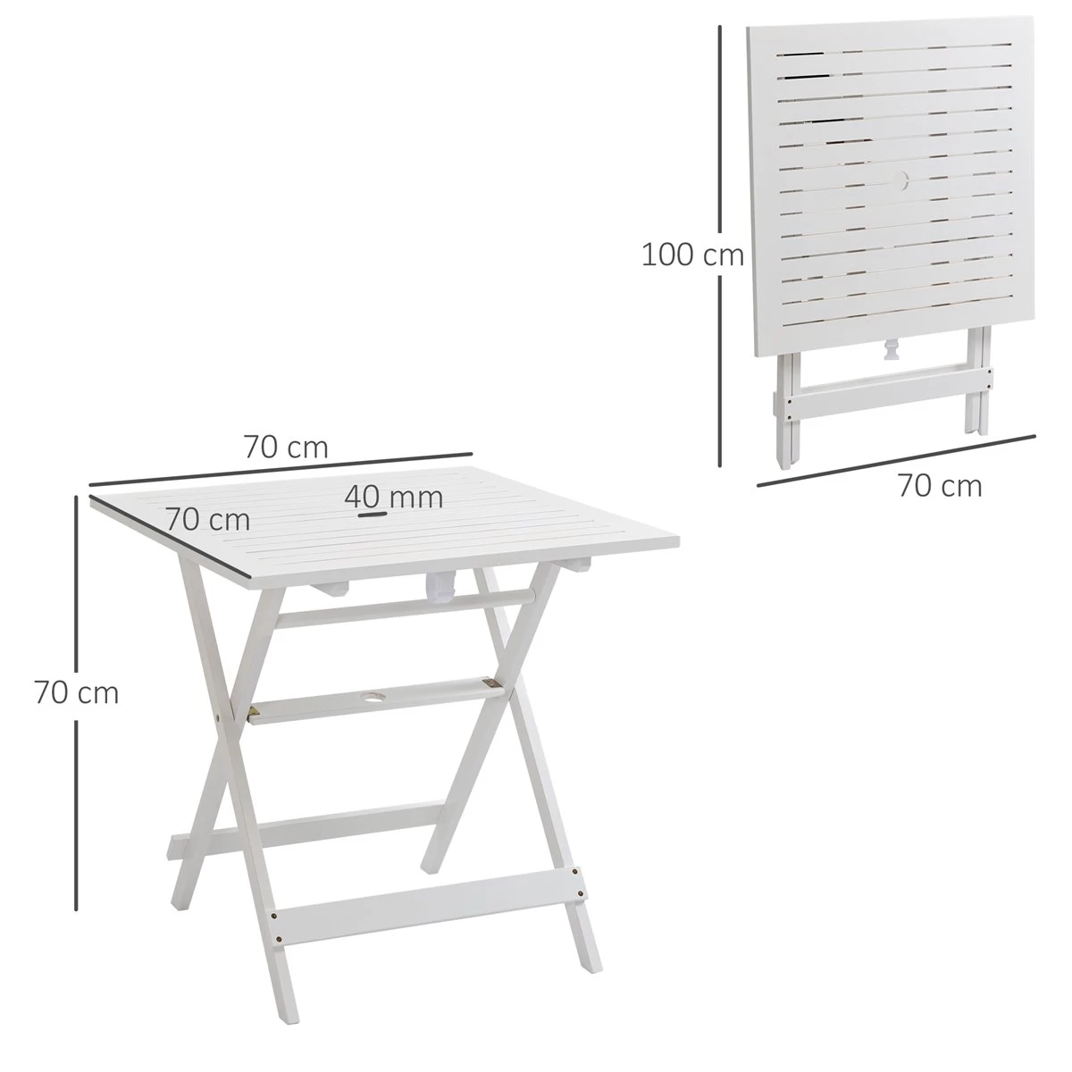 ¿Estás preparando tu terraza o jardín para la llegada del buen tiempo? ¿Tienes poco espacio, pero no quieres renunciar a tener una mesa de comedor en tu espacio exterior? Entonces esta mesa auxiliar de jardín de Outsunny te irá genial. Con estructura de madera en color blanco, combinará fácilmente con el resto de muebles y espacios. Y lo mejor de todo, es que tiene un agujero en el centro para colocar un parasol. Y cuando no la uses, pliégala y podrás guardarla sin ocupar apenas espacio.