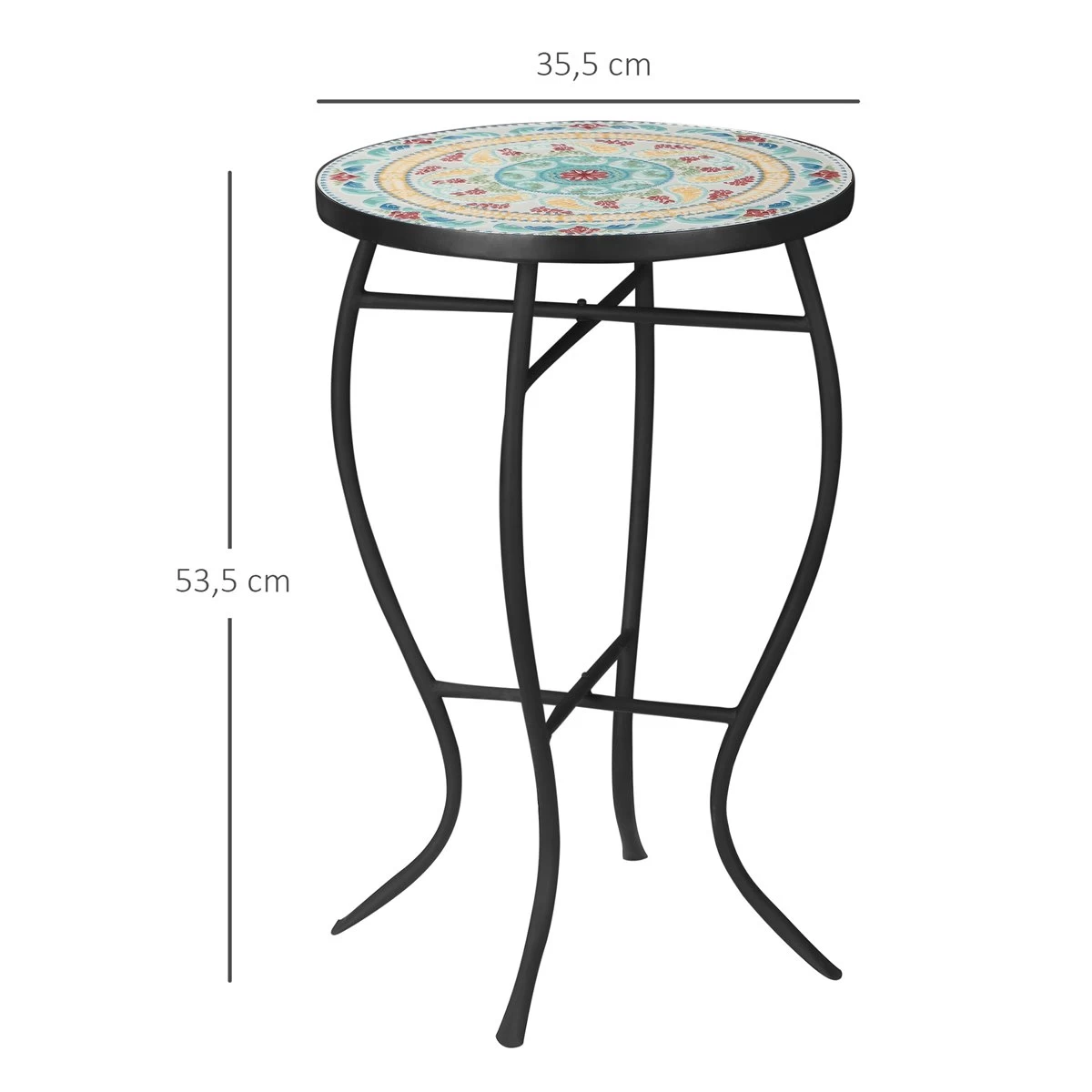 ¿Estás preparando tu terraza o jardín para la llegada del buen tiempo? Entonces esta mesa con mosaico de jardín de Outsunny seguro que te encantará. La mesa cuenta con una bonita estructura metálica con patas curvas y una encimera con un grabado colorido tipo mosaico. Es tan bonita que, aunque esté diseñada para estar a la intemperie, podrás usarla también en el salón, como mesita de noche o en otros espacios interiores de tu casa. Incluso usarla como soporte para tus plantas.