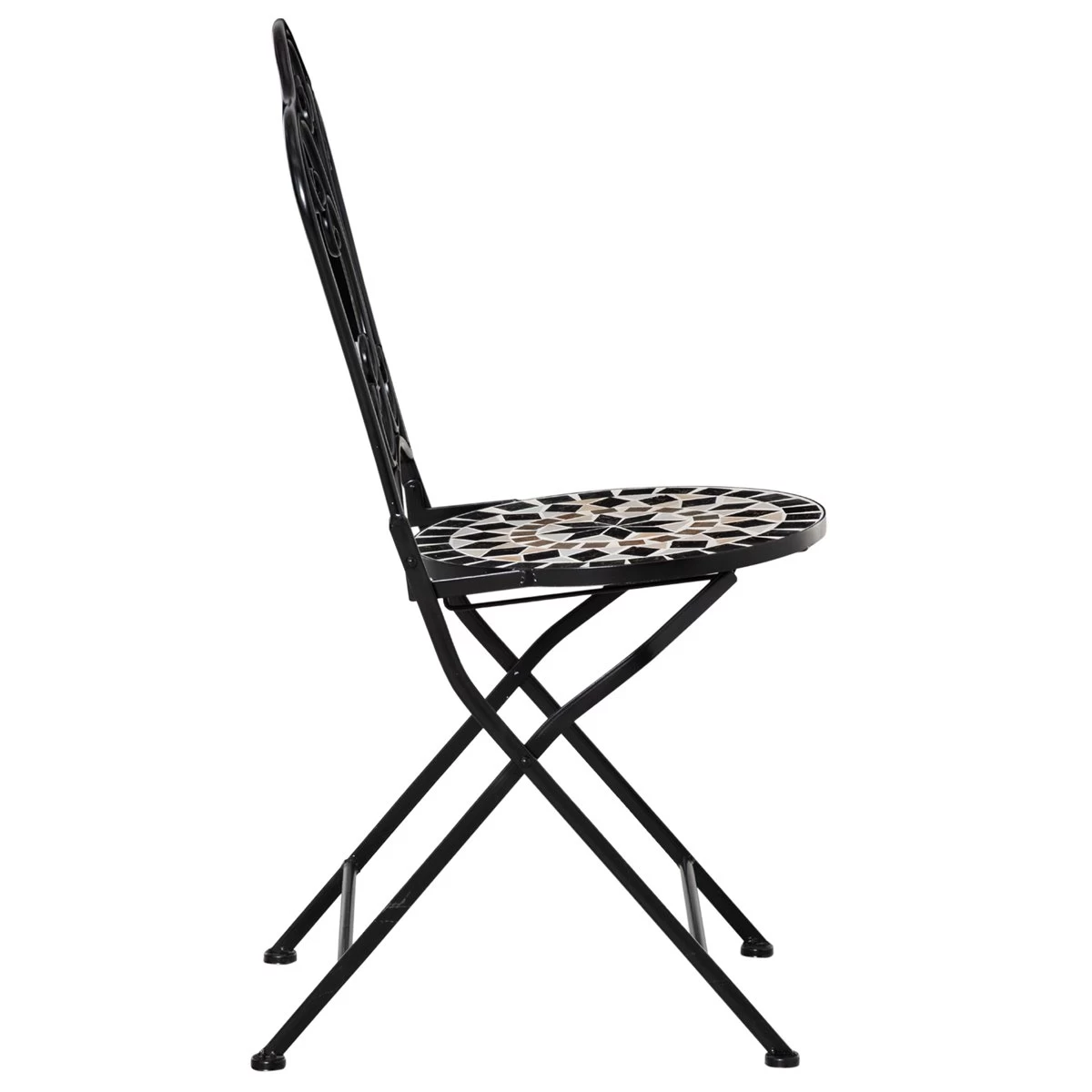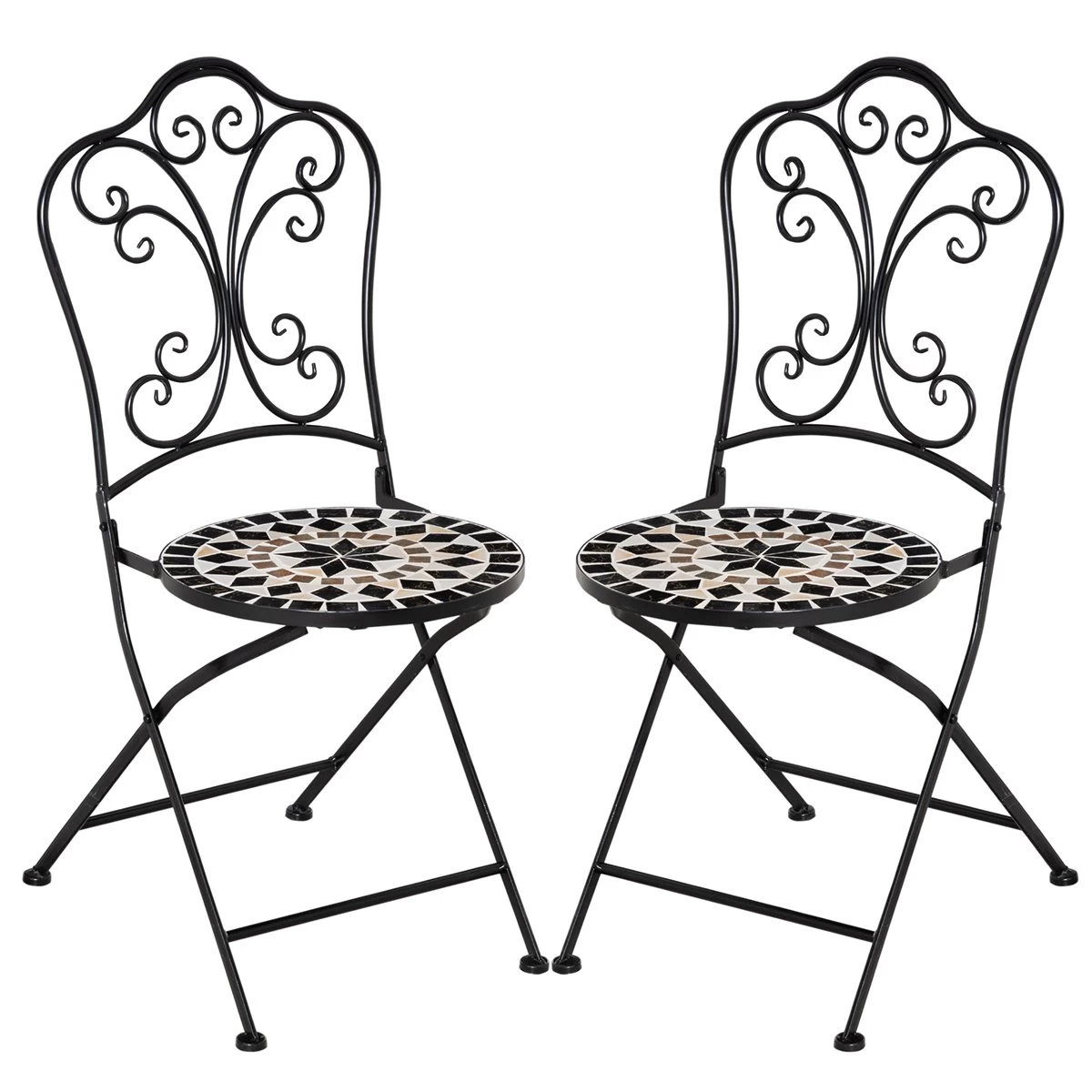 - – CONJUNTO DE 2 SILLAS: Este producto está compuesto por 2 sillas de idénticas características. Son 2 sillas plegables perfectas para combinar con una bonita mesa en tu jardín, patio, terraza o cualquier otro espacio al aire libre – ASIENTO CON DISEÑO DE MOSAICO: Sillas de cerámica de diseño elegante con bonito respaldo forjado y asiento con bonito diseño en mosaico de diferentes tonalidades (negro, beige, blanco. Su colocación dará un toque distintivo y elegante a tu espacio exterior – PLEGABLE: Estas sillas bistrós de jardín son fáciles de plegar, por lo que ahorrarás espacio cuando no vayas a usarlas, pudiéndolas tener en cualquier esquina, apoyadas en la pared o detrás de una puerta. Son perfectas para tener en espacios pequeños – RESISTENTE Y ESTABLE: La estructura de este 2 sillas de mosaico está fabricada en metal con tratamiento de electroforesis resistente a la corrosión y a la intemperie. La forma de X curvada de las patas, junto con las 2 barras de refuerzo, además de darle un toque extra de elegancia, mejoran su estabilidad – MEDIDAS TOTALES: 40x50x92 cm (LxANxAL. Medidas plegadas: 99x43x10 cm (LxANxAL. Peso máximo soportado: 120 kg (cada una. No requiere montaje