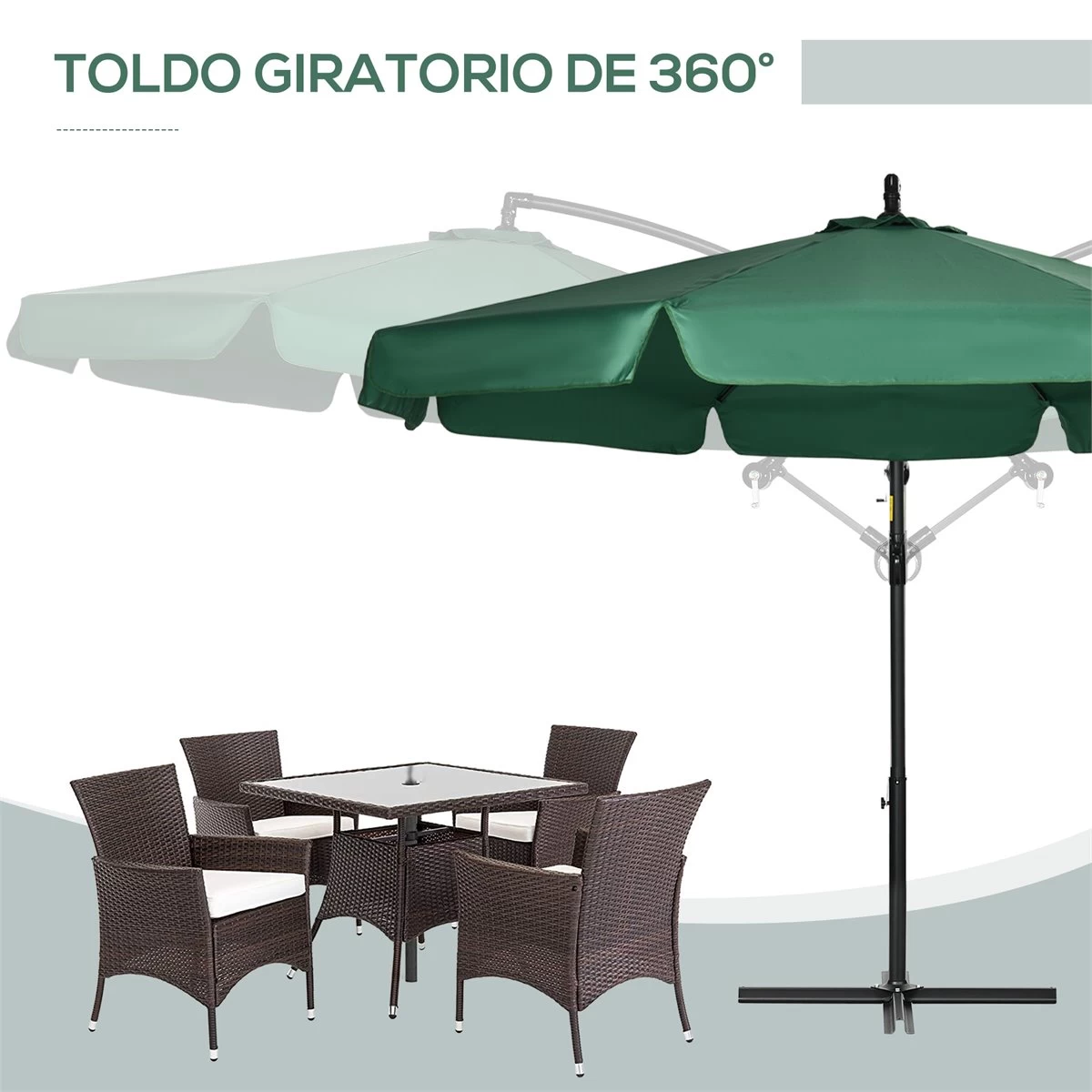 Esta elegante sombrilla de jardín de Outsunny es un accesorio imprescindible para el verano. Su diseño con poste excéntrico te ofrece un espacio sombrado que no se ve condicionado como pasa en ocasiones con las sombrillas con poste central, protegiendo del sol incluso mesas grandes, sofás, conjuntos y más. Con estructura robusta de metal con 8 varillas que sujetan firmemente el toldo, proporciona mucha sombra, refresca los calurosos días de verano y también crea un ambiente agradable. Características – Sombrilla en voladizo excéntrica para proporcionar sombra y protegerle del sol – Proporciona sombra para una mesa con seis a ocho sillas – Inclinación ajustable y rotación de 360 grados para sombrear cualquier espacio sin tener que mover la sombrilla de sitio – Sombrilla fácil y rápida de abrir mediante la manivela lateral – Fabricada con tejido de poliéster apto para exteriores y un armazón de acero con recubrimiento en polvo para una gran estabilidad – Toldo ventilado que le ayuda a mantenerse estable frente al viento – Parasol adecuado para tener en cualquier espacio exterior como el jardín, patio, terraza, zona de piscina y más – Se requiere montaje Especificaciones – Color: verde – Material: poliéster de 180 g/m², acero – Diámetro del parasol: 293 cm – Altura del parasol: 240 cm – Altura inferior del toldo: 204 cm – Medidas de la base: 100x100x4 cm (LxANxAL – Referencia: 84D-214V00GN – NOTA 1: Peso de 80 kg requerido no incluido. SKU de contrapeso Outsunny compatible: 84D-061, 84D-132, 84D-134 – NOTA 2: No usar la sombrilla en condiciones climáticas extremas (viento fuerte, lluvia intensa, nieve.