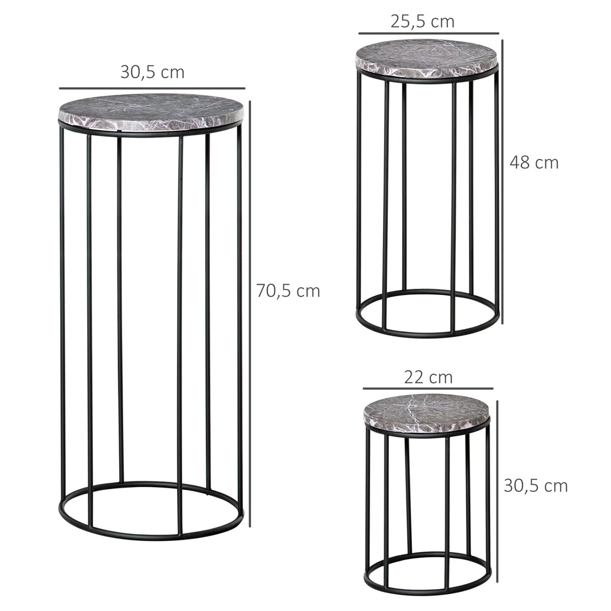 - – SET DE 3 SOPORTES PARA PLANTAS: Este juego de 3 piezas incluye maceteros de diferentes tamaños, adecuados para colocar diferentes tipos de plantas u otros adornos pequeños. Se pueden usar como mesas altas o pedestales – DISEÑO APILABLE: Los 3 soportes para plantas se pueden apilar fácilmente uno sobre el otro cuando no se usan, lo que le ayuda a ahorrar espacio y facilita su almacenaje – ENCIMERA CON SEMBLANTE AL MÁRMOL: Las encimeras metálicas de los soportes con apariencia marmoleada aportará un toque de modernidad, elegancia y estilo refinado a tu porche, balcón, jardín o espacio interior – ESTRUCTURA METÁLICA: Este conjunto de soportes para plantas presenta una estructura metálica con gran capacidad de carga, soportando cada uno un peso máximo de 20 kg. Son unos soportes resistentes y estables – MEDIDAS TOTALES: Ø22×30,5 cm (soporte pequeño, Ø25,5×48 cm (soporte mediano y Ø30,5×70,5 cm (soporte grande. Peso máximo soportado: 20 kg (cada soporte. No requiere montaje