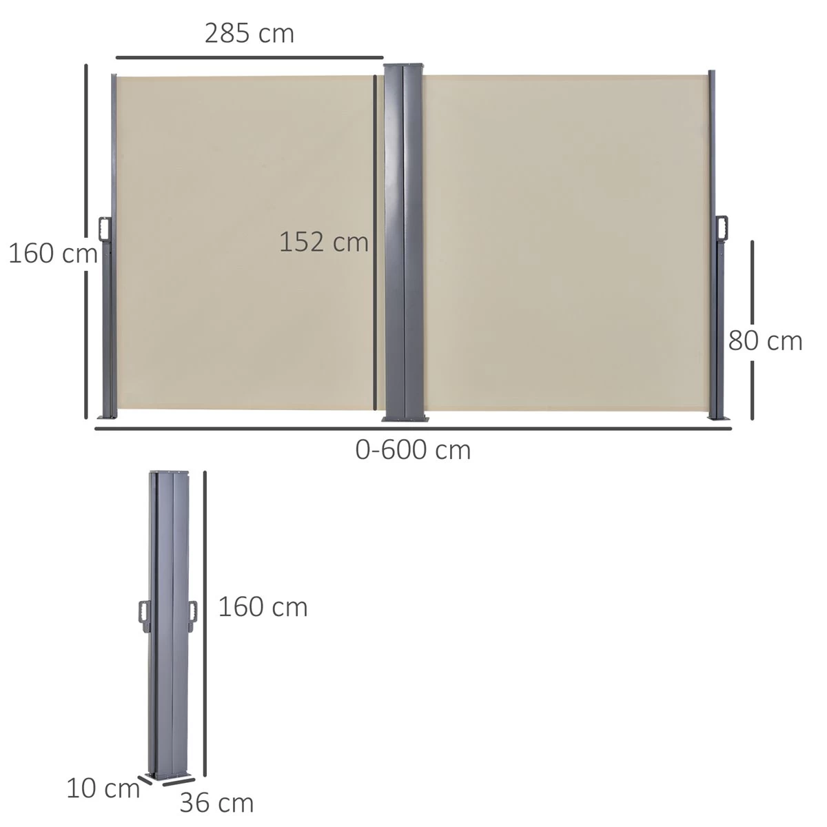 - – TOLDO LATERAL DOBLE: Este toldo retráctril exterior con cobertura de 280 g/m² con revestimiento de PU es ideal para quienes desean resguardarse del sol o en viento o desean un espacio exterior con mayor privacidad – PROTECCIÓN EFICIENTE: Este toldo lateral de pared cuenta con protección contra los rayos UV, el viento o la lluvia ligera. Ideal para ser utilizado como pared para una mayor privacidad en tu jardín, piscina, balcones o donde lo necesites – FÁCIL DE USAR: Este toldo lateral es muy fácil de usar, tan fácil como fijar los postes de soporte y anclarlos al suelo. Para abrir, simplemente se debe de tirar de los lados y cuando no vayas a usarlo, al ser retráctil no ocupará apenas espacio y quedará protegido – ESTRUCTURA RESISTENTE: Este toldo retráctil de balcón cuenta con un marco de acero con recubrimiento en polvo para mayor resistencia a la intemperie y a la corrosión. Con toldo de poliéster resistente al agua y con protección UV – MEDIDAS TOTALES: 600×160 cm (completamente extendido y 36x10x160 cm (retraído. Requiere montaje