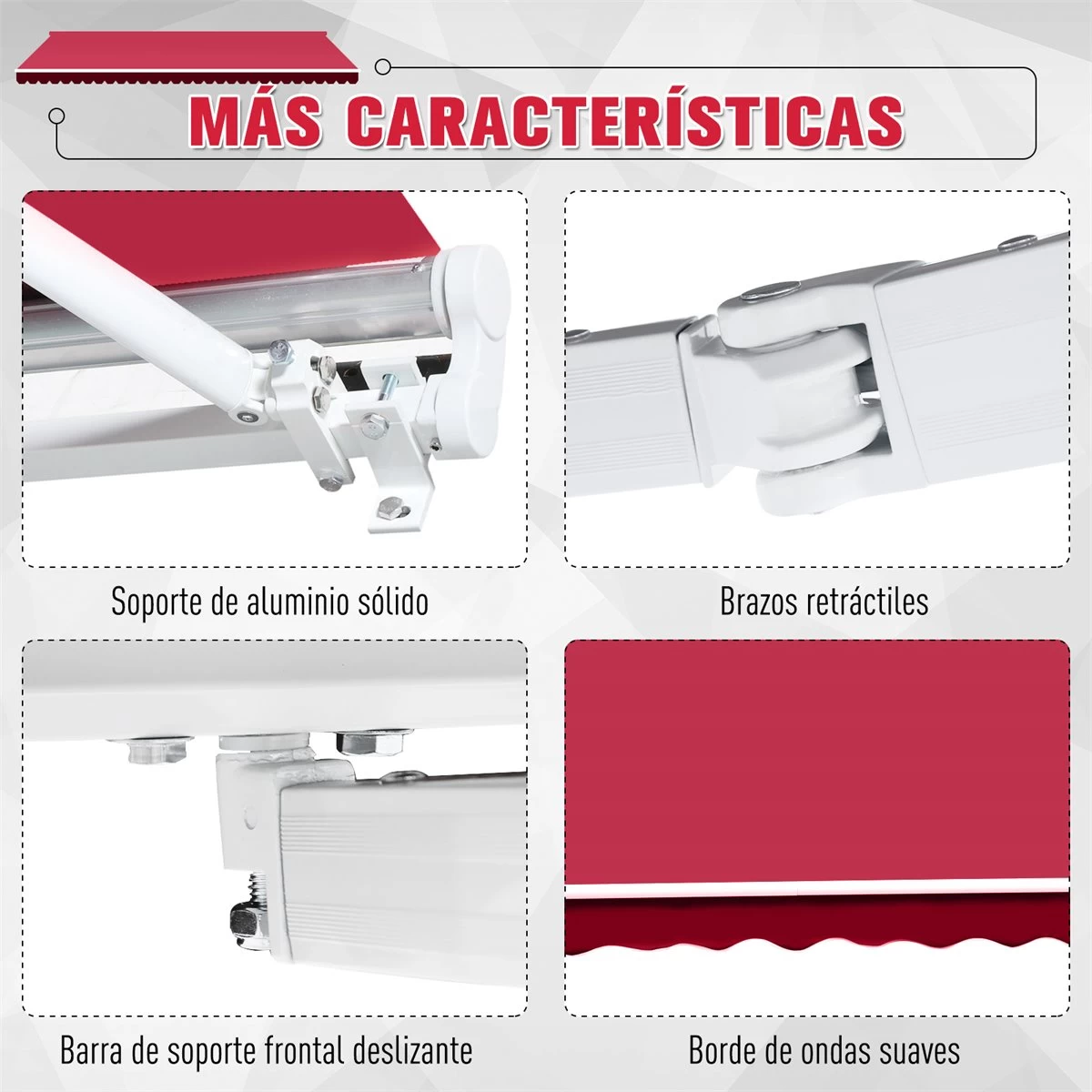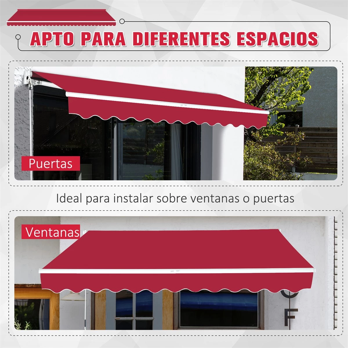 - – Este toldo manual es ideal para instalar en su patio, balcón y terraza, que protege de los rayos de sol y lluvia, crea un ambiente fresco y agradable – Gracias a su elegante diseño con borde decorativo en forma ola, combina perfectamente en cualquier espacio exterior – Hecho de tela de poliéster de 280g/m² resistente al agua y UV, manivela de acero y brazos de aluminio duradero que garantiza un largo tiempo de uso – Se abre y cierre fácilmente a través de la manivela. Fácil de montar y desmontar para guardarlo en invierno – Incluye soportes y tornillos para su fijación. Dimensiones totales: 395×245 cm (LxAN, dimensiones de la manivela: Ф14x1480mm (DxL, longitud del borde: 20 cm. Certificación: CE Nota; La plancha de mano para toldos solo se puede instalar en un lado