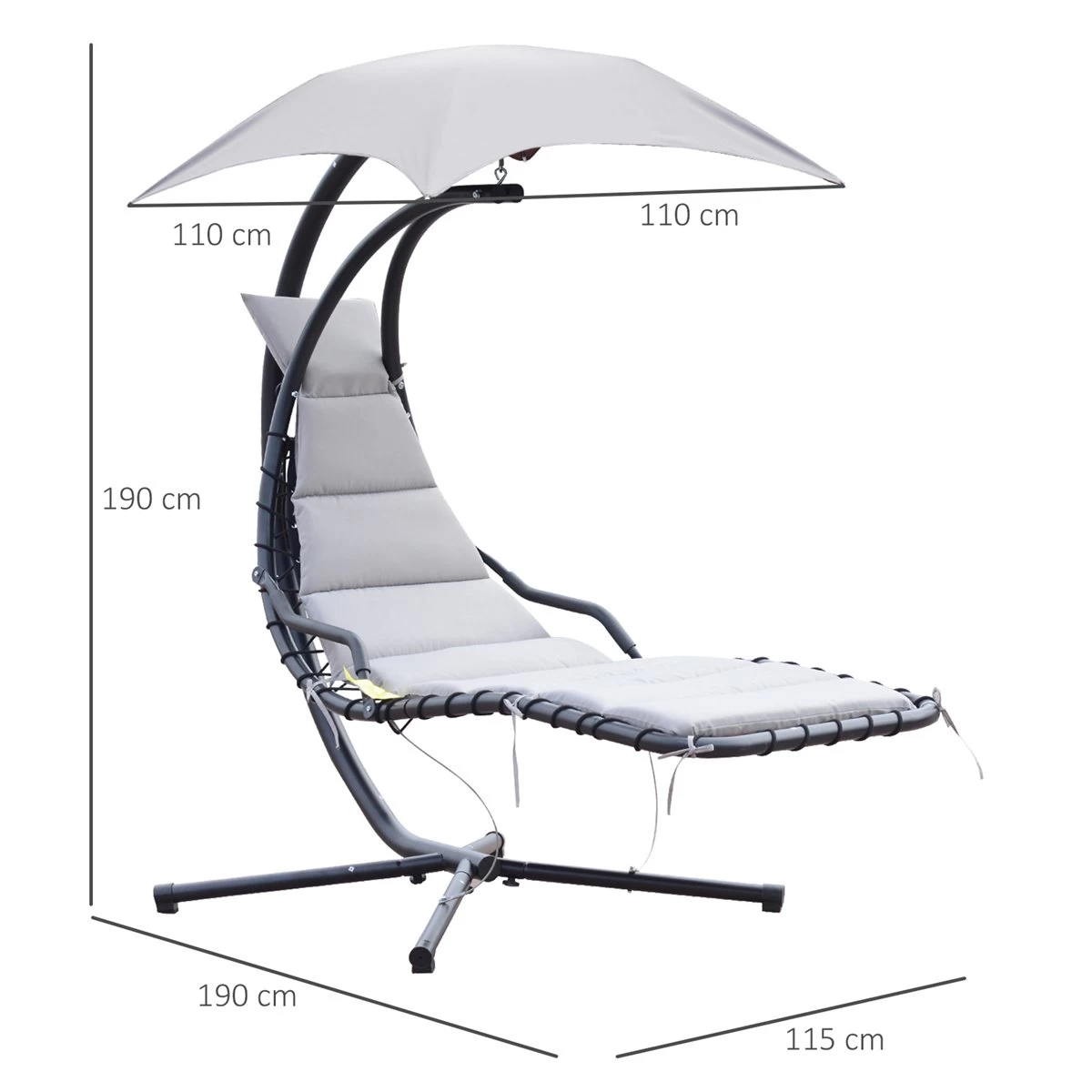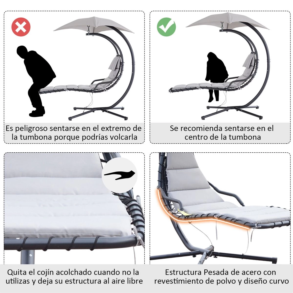 - – DISEÑO ERGONÓMICO: El diseño ergonómico de nuestra tumbona suspendida con parasol y soporte Outsunny es curvo y se adapta perfectamente a tu cuerpo proporcionándote mayor comodidad. Ideal para uso en exteriores como jardines, patios, balcones, entre otros – CON SOMBRILLA INTEGRADA: Esta mecedora tiene una pequeña sombrilla integrada en el soporte, ideal para protegerte de los rayos del sol, proporcionando así un lugar cómodo para leer un libro y relajarte – MÁXIMO CONFORT: El cojín de esta tumbona relleno de una agradable espuma de alta densidad proporciona una experiencia de descanso más cómoda. Además, tiene un cojín para la cabeza para un mejor soporte de la cabeza y el cuello – RESISTENTE Y ESTABLE: Tumbona fabricada con estructura de metal lacado con pintura con recubrimiento en polvo de alta resistencia y 4 patas con tacos de goma que aportan mayor estabilidad y evitan que se raye el suelo. Además, para aumentar la estabilidad y la seguridad, esta tumbona tiene cables de metal conectados al marco y a los pies. Para evitar vuelcos accidentales, hay una cuerda de seguridad debajo de la silla para mejorar la seguridad. – MEDIDAS TOTALES: 190x110x190 cm (LxANxAL. Medidas del parasol: 115×115 cm. Altura del asiento: 57 cm. Peso máximo soportado: 100 kg. Requiere montaje