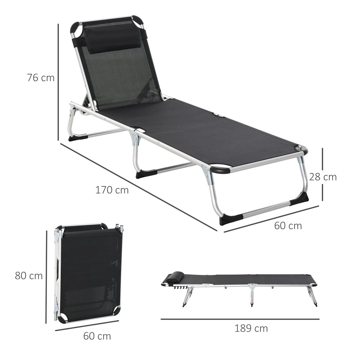 Esta tumbona plegable de exterior de Outsunny es ideal para tumbarse al sol en la playa, terraza, montaña, camping o cerca de la piscina. Su respaldo se puede reclinar en 4 posiciones diferentes y dispone de un cojín para la cabeza extraíble, para que puedas usarlo o no según tus gustos y necesidades. Su robusto marco de aluminio es capaz de soportar hasta 120 kg. ¡Disfruta de un merecido descanso en tu jardín mientras lees tu libro favorito!