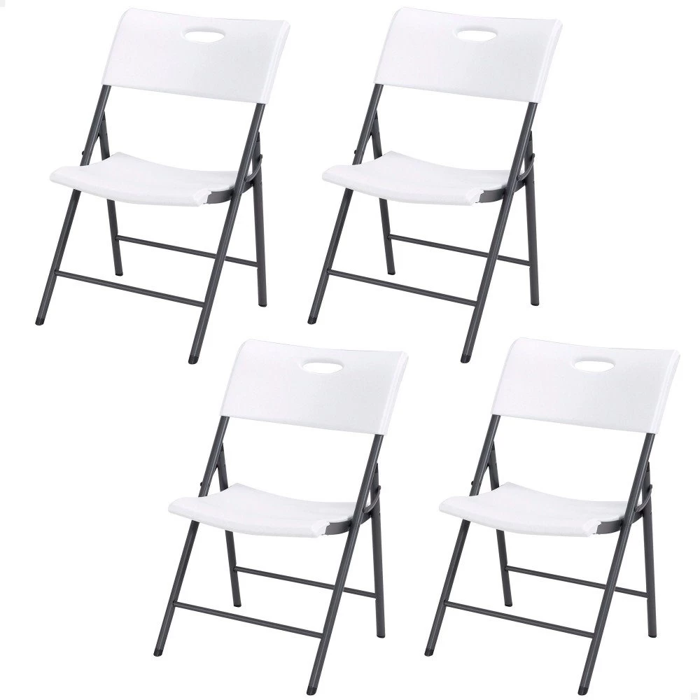 Pack 4 sillas plegables blancas, ligeras y versátiles Lifetime. Base y respaldo contorneados de polietileno de alta densidad con protección UV, resistente al agua y a las manchas. Estructura con tubos de acero con recubrimiento en polvo antióxido. Silla robusta, ultrarresistente y duradera. Medidas: 50 x 58 x 82,5 cm. Perfecta para exterior o interior. Perfil estrecho, fácil transporte, limpieza y almacenaje.