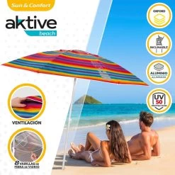 Sombrilla Playa Antiviento Ø220 Cm Multicolor C/mástil Inclinable Y Protección UV50 Aktive