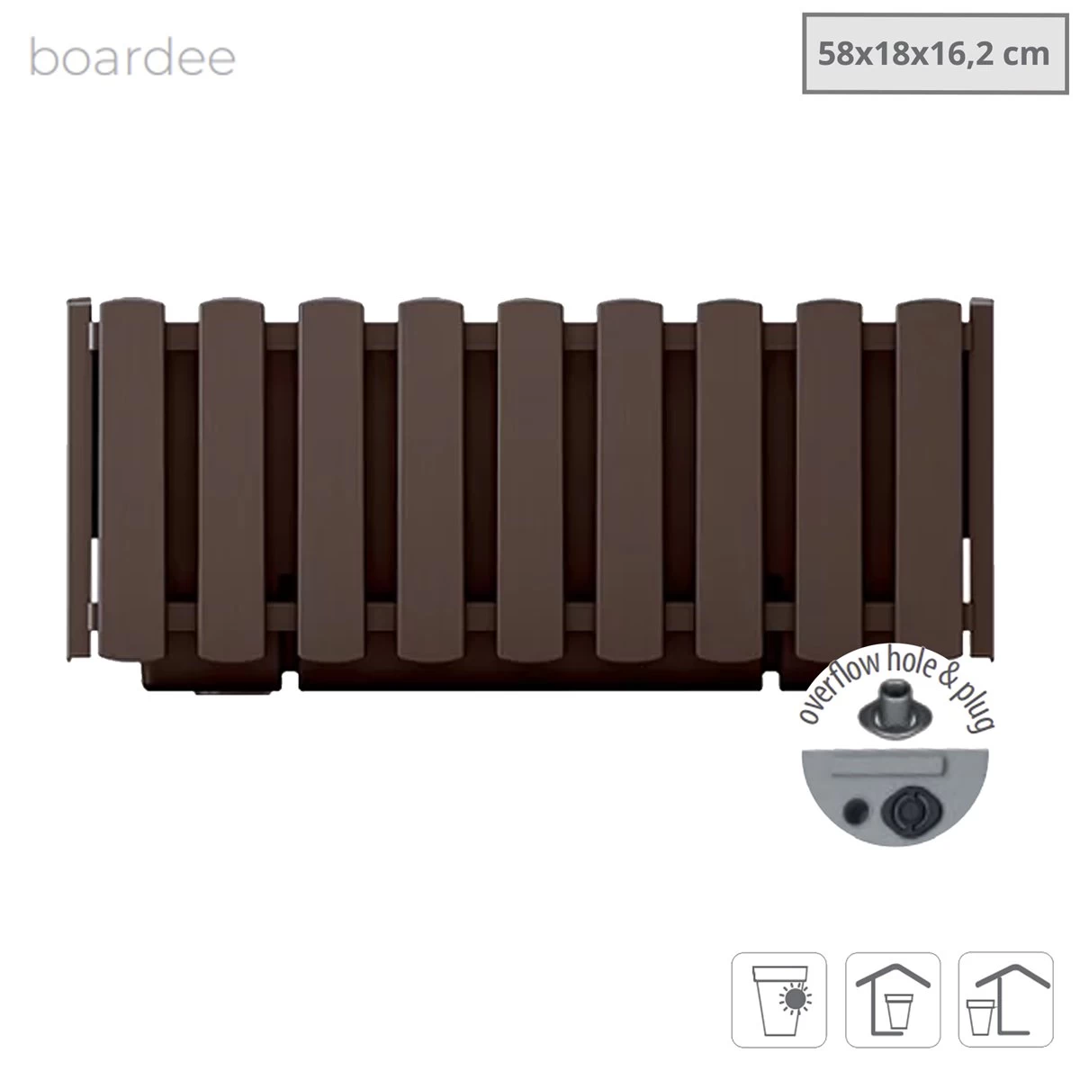 Jardinera para balcón de la colección BOARDEE FENCYCASEDimensiones: 580x180x162Marrón