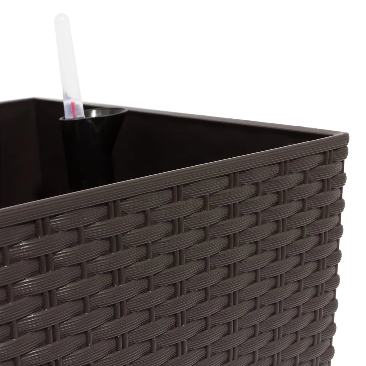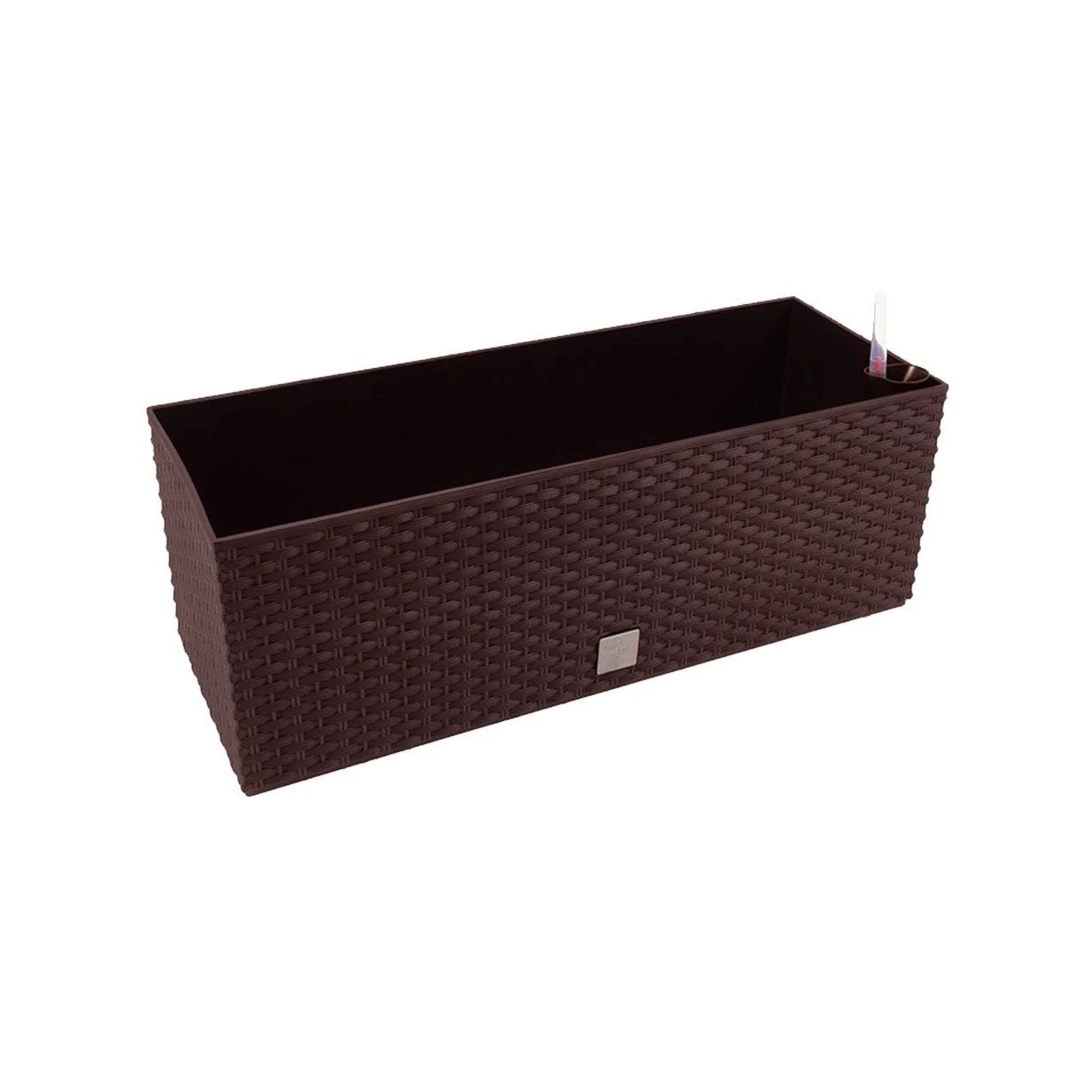 Jardinera con acabado exterior Simil Rattan, fabricada en plástico inyectado de gran calidad. Especial para interior, exterior o terraza.• Sistema de autorriego incluido.• Capacidad: 17 litros.• Dimensiones: 52 x 20 x 19 cm.• Color chocolate.