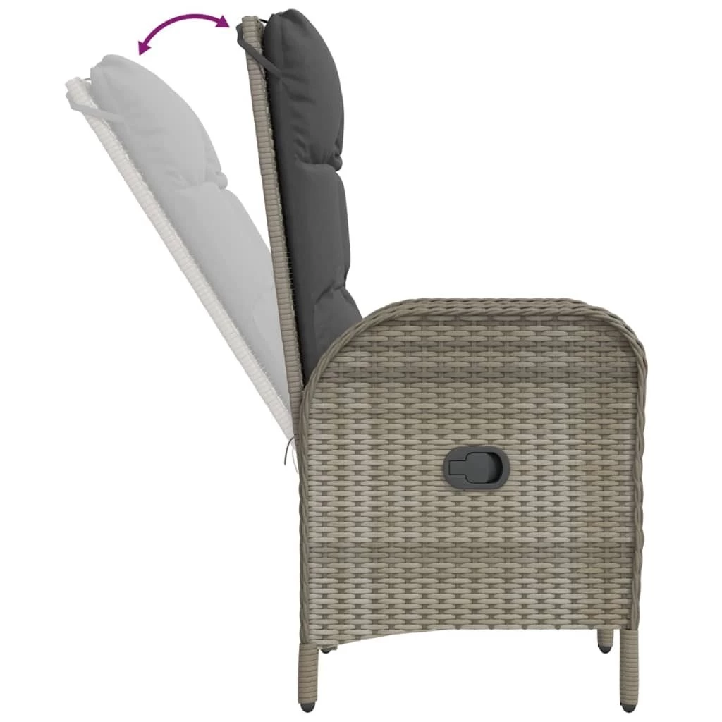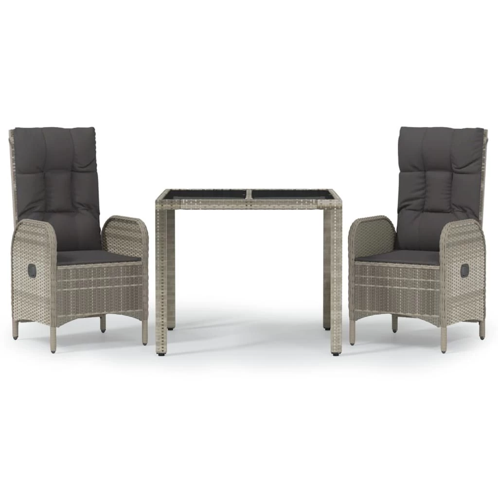 Este moderno juego de comedor de jardín, con un diseño elegante y contemporáneo, es una excelente opción para comer o relajarse en el jardín. Material resistente a la intemperie: El ratán PE, también conocido como ratán sintético, es resistente a la intemperie y fácil de limpiar. La parte exterior se mantiene hermosa durante mucho tiempo. Ofrece una gran calidad, comodidad y aspecto estético.Estructura robusta: Las estructuras de acero con recubrimiento en polvo hacen que el juego de comedor para exterior sea resistente y estable para usar a diario al aire libre.Práctica superficie: La superficie lisa de la mesa de jardín está hecha de vidrio templado, fácil de limpiar con un paño húmedo. Además, la robusta superficie de la mesa es perfecta para colocar comidas, bebidas y elementos decorativos.Función reclinable: Las sillas de jardín está especialmente diseñadas con una función reclinable para que puedas ajustar el respaldo según tu comodidad.Cómodo asiento: El respaldo añade un plus de comodidad al asiento de la silla de jardín. Además, los cojines gruesos y acolchados proporcionan comodidad al asiento. Información útil:Para facilitar al máximo el montaje, cada producto se entrega con un manual. Nota:Para asegurarte de que tus muebles de exterior se mantengan hermosos, recomendamos protegerlos con una funda impermeable. Color: GrisColor de cojín: Gris oscuroSilla reclinable de jardín:Material: Ratán PE, acero con recubrimiento en polvoMaterial de la funda del cojín: Tela (100% poliésterDimensiones: 57 x 62,5 x 109 cm (ancho x profundo x altoDimensiones del asiento: 50 x 47 cm (ancho x profundoAltura del asiento desde el suelo: 43 cmAltura del reposabrazos desde el suelo: 62 cmDimensiones del cojín de respaldo: 50 x 68 x 10 cm (ancho x profundo x grosorDimensiones del cojín de asiento: 50 x 47 x 3 cm (ancho x profundo x grosorRespaldo ajustableMesa:Material: Ratán PE, acero con recubrimiento en polvo, vidrio templadoDimensiones: 90 x 90 x 75 cm (ancho x profundo x altoLa entrega incluye:2 x Sillas reclinables de jardín2 x Cojines de respaldo2 x Cojines de asiento1 x Mesa