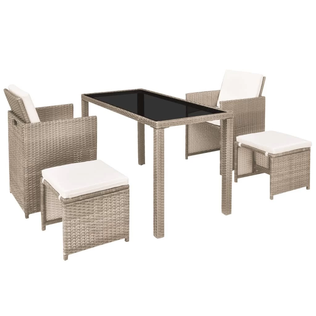 Nuestro elegante juego de comedor de ratán se convertirá en el centro de atención de tu jardín o patio. Este set de comedor, con un diseño elegante, serán una gran opción para todas las comidas al aire libre o relajarse en el jardín. La estructura de acero con recubrimiento en polvo brindan fuerza y resistencia a las mesas y sillas, y gracias a su construcción ligera, todos los muebles son fáciles de desplazar. Gracias al ratán PE impermeable y resistente a la intemperie, el servicio de comedor es fácil de limpiar. La encimera de cristal templado también se puede limpiar fácilmente con un paño húmedo. Los gruesos y suaves asientos rellenos de gomaespuma son muy cómodos y están hechos de poliéster hidrófugo. Las fundas extraíbles y lavables están equipadas con cremalleras. Además, puede bajar el respaldo y almacenar todas las sillas debajo de la mesa para ahorrar espacio de almacenamiento cuando no esté usando el set. La entrega incluye 1 mesa, 2 sillas, 2 taburetes y 6 cojines. Nota: Te recomendamos cubrir el conjunto en condiciones de lluvia, nieve o heladas. Color del ratán: Gris/beigeColor de los cojines: Blanco cremaMaterial: Estructura de acero + ratán PE + encimera de cristalMaterial de cojín: Funda de poliéster con relleno de espumaDimensiones de la mesa: 123 x 60 x 74 cm (largo x ancho x altoDimensiones de las sillas: 52 x 56 x 85 cm (ancho x profundo x altoAnchura del asiento: 47 cmProfundidad del asiento: 36 cmAltura del asiento desde el suelo: 44 cmAltura del reposabrazos desde el suelo: 67 cmDimensiones taburete con cojín: 40 x 40 x 42 cm (longitud x anchura x alturaDimensiones taburete sin cojín: 40 x 40 x 36 cm (longitud x anchura x alturaGrosor del cojín: 5 cmFundas de cojín extraíbles y lavablesFácil montajeLa entrega incluye:1 x Mesa2 x Sillas2 x Taburetes6 x Cojines