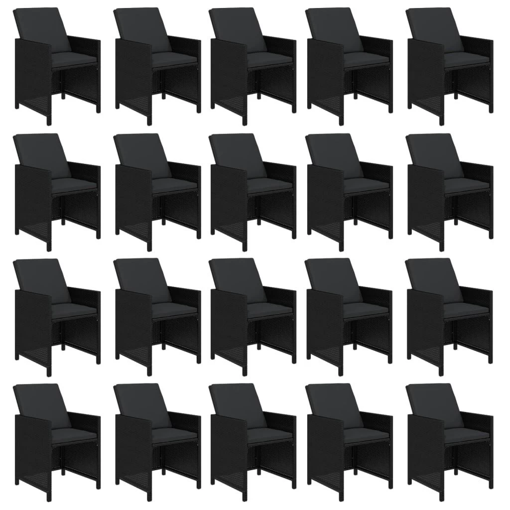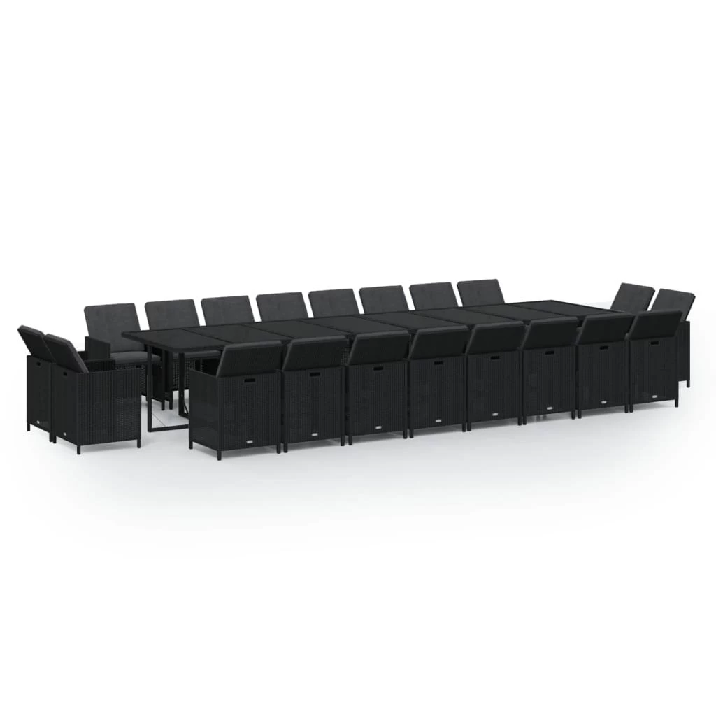 Este juego de comedor para jardín de ratán sintético, con un diseño elegante y único, es una excelente opción para cenar y relajarte en el espacio al aire libre de la casa. Material práctico: Envuelto en ratán PE resistente a la intemperie, este juego de comedor para jardín es fácil de limpiar y resistente, y brinda años de relajación de calidad.Estructura estable y fuerte: Las estructuras de acero de la mesa y las sillas de jardín garantizan su robustez y estabilidad.Sillas flexibles: Puedes tirar de los respaldos hacia abajo y guardar las sillas al aire libre debajo de la mesa, lo que ahorra un valioso espacio de almacenamiento cuando el conjunto no se usa.Experiencia cómoda: El asiento y los cojines traseros gruesos, suaves y rellenos de espuma también añaden comodidad a los asientos. Nota:Para prolongar la vida de tus muebles de exterior, te recomendamos que los protejas con una funda impermeable. Mesa:Color: NegroMaterial: Ratán PE, acero con recubrimiento en polvo, vidrio templadoDimensiones: 443 x 107 x 74 cm (largo x ancho x altoGrosor del vidrio: 5 mmSilla:Color de ratán sintético: NegroColor del cojín: NegroMaterial: Ratán PE, acero con recubrimiento en polvo, tela (100% poliésterDimensiones: 52 x 56 x 85 cm (ancho x profundo x altoDimensiones de asiento: 46 x 41 cm (ancho x profundoAltura del asiento desde el suelo (sin cojín: 45 cmAltura del reposabrazos desde el suelo: 64 cmDimensiones del cojín del asiento/respaldo: 46 x 41 x 5 cm (ancho x profundo x grosorRequiere montaje: SíLa entrega incluye:1 x Mesa20 x Sillas20 x Cojines de asiento20 x Cojines de respaldo