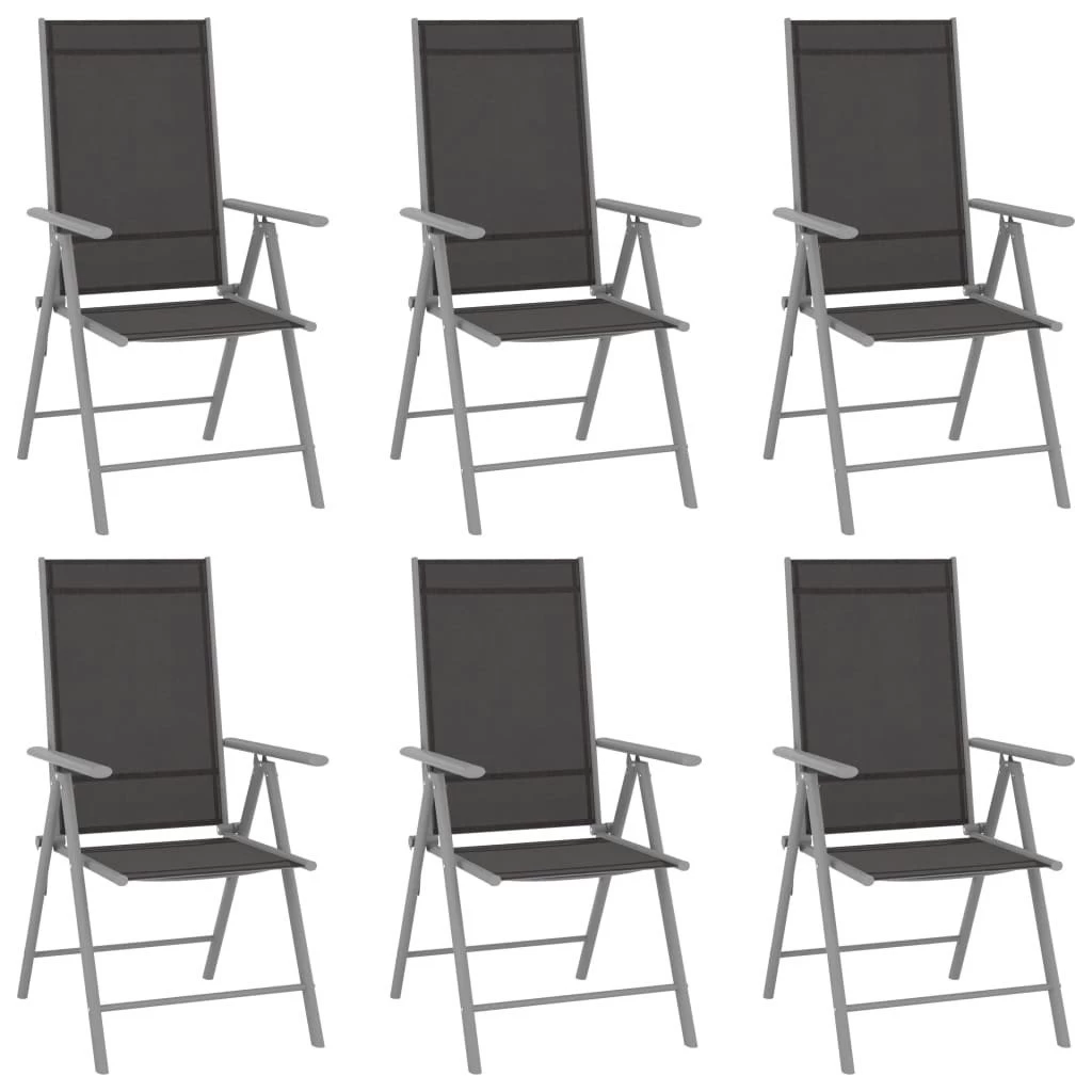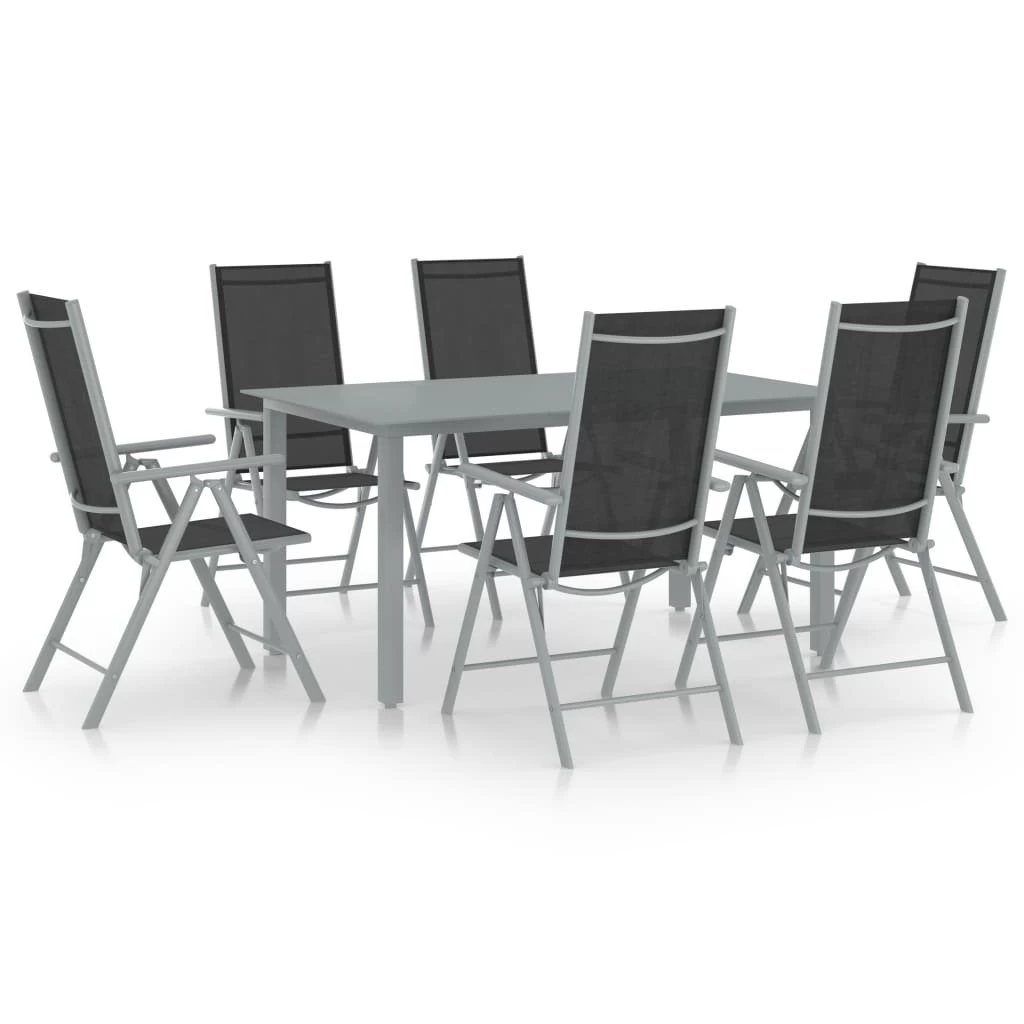 Este juego de comedor para jardín, práctico y elegante, es perfecto para relajarse o cenar en el jardín o patio. La estructura de aluminio con recubrimiento en polvo hace que el conjunto de muebles sea muy robusto y duradero. Las sillas de jardín tienen asientos y respaldos de textilene suave al tacto, son regulables en 7 posiciones, por lo que siempre puedes encontrar la posición de asiento más cómoda. Las sillas con reposabrazos se pueden plegar para ahorrar espacio cuando no se utilizan. La mesa tiene una superficie WPC de vidrio, que es fácil de limpiar y apta para usar al aire libre. Nota: Para prolongar la vida útil de los muebles de exterior, te recomendamos que los limpies con regularidad y no los dejes al aire libre sin protección innecesariamente.Limpieza: Usar una solución de jabón suaveAlmacenamiento: Si es posible, guarda el producto en un lugar fresco y seco en el interior. Si el producto se almacena al aire libre, protégelo con una funda impermeable. Limpia y seca el exceso de agua o nieve de las superficies planas después de una lluvia o nevada. Permite la ventilación para evitar daños relacionados con la humedad. Color: Plateado y negroMaterial: Aluminio con recubrimiento en polvo, textilene, vidrioDimensiones de la silla: 54 x 73 x 107 cm (ancho x profundo x altoAnchura del asiento: 44 cmProfundidad del asiento: 44 cmAltura del asiento desde el suelo: 43,5 cmAltura del reposabrazos desde el suelo: 65 cmEl respaldo se reclina en 7 posicionesDimensiones de la mesa: 150 x 90 x 74 cm (largo x ancho x altoRequiere montaje: SíLa entrega incluye:1 x Mesa6 x Sillas
