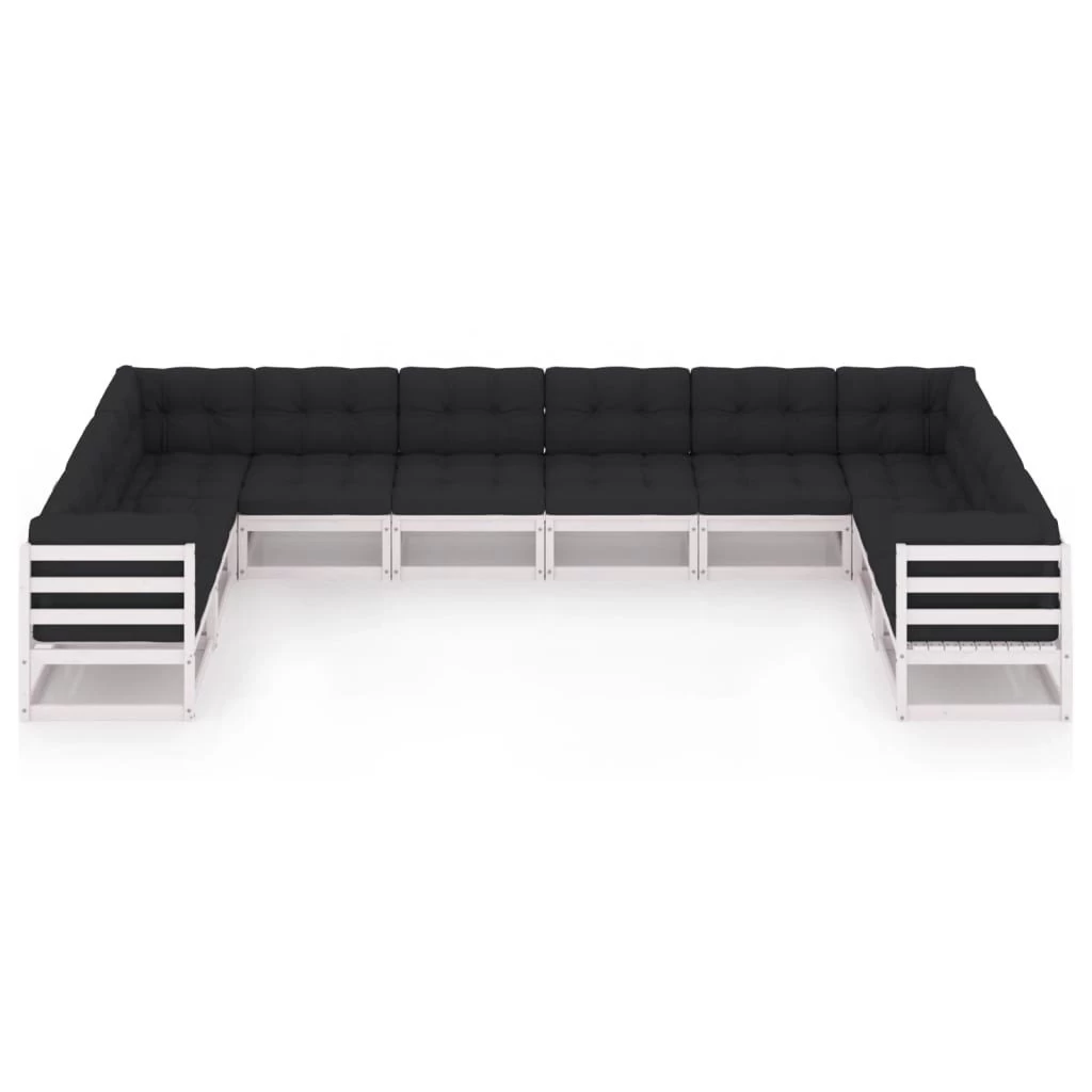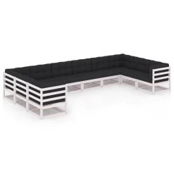 Este juego de salón de jardín es una opción ideal para relajarse y disfrutar del buen tiempo, echar una siesta o charlar con tu familia o amigos. El conjunto de sofás está fabricado en madera de pino maciza, lo que lo hace robusto y estable. Este conjunto tiene una construcción sólida y requiere poco mantenimiento. Los cojines añaden comodidad adicional. Este conjunto de muebles agregará un toque de encanto rústico a tu espacio exterior. Nota: Para prolongar la vida de tus muebles de exterior, te recomendamos que los protejas con una funda impermeable. Color del sofá: BlancoColor de cojín: Gris antracita oscuroMaterial: Madera maciza de pino, tela (100% poliésterDimensiones del sofá de esquina: 70 x 70 x 67 cm (ancho x profundo x altoDimensiones del sofá central: 70 x 70 x 67 cm (ancho x profundo x altoDimensiones del cojín del asiento: 70 x 70 x 8 cm (largo x ancho x grosorDimensiones del cojín del respaldo: 70 x 40 x 8 cm (largo x ancho x grosorRequiere montaje: SíLa entrega contiene:4 x Sofás de esquina6 x Sofás centrales10 x Cojines de asiento14 x Cojines de respaldo