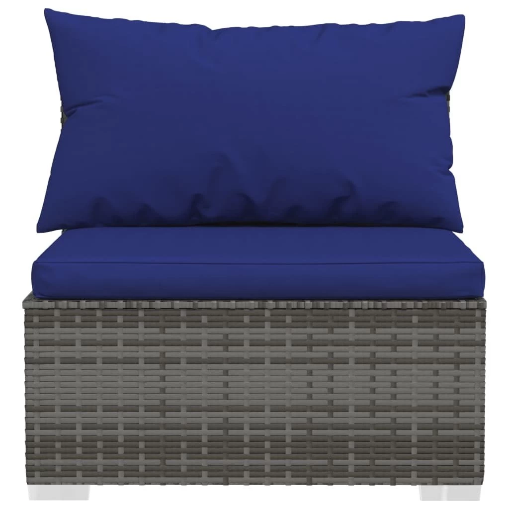 ¡Relájate y disfruta de tu tiempo libre con este moderno juego de muebles de jardín! Está destinado a satisfacer diferentes necesidades. Estructura robusta: Este asiento para patio cuenta con una robusta estructura de acero con recubrimiento en polvo y patas de plástico cromado, que es muy duradero.Material de primera calidad: El sofá de jardín está diseñado con ratán PE resistente al agua, por lo que es fácil de limpiar, robusto y adecuado para usar a diario al aire libre.Diseño modular: El diseño modular también permite colocar el conjunto en cualquier disposición o combinarlos con otros segmentos modulares para satisfacer tus necesidades.Cómodos cojines y almohadas: Los cojines y las almohadas acolchados gruesos y extraíbles brindan una comodidad óptima para que te sientes al aire libre. Nota:Para prolongar la vida de tus muebles de exterior, te recomendamos que los protejas con una funda impermeable. Color: GrisColor del cojín: Azul oscuroMaterial: Ratán PE, acero con recubrimiento en polvo, plásticoMaterial del cojín/almohadón: Tela (100% poliésterSofá central:Dimensiones de cada sofá central: 70 x 70 x 60,5 cm (largo x ancho x altoProfundidad del asiento: 63 cmAltura del asiento desde el suelo: 30 cmDimensiones del cojín de asiento: 70 x 63 x 3 cm (largo x ancho x grosorDimensiones del almohadón de respaldo: 70 x 40,5 cm (largo x anchoSofá esquinero:Dimensiones: 70 x 70 x 60,5 cm (largo x ancho x altoProfundidad del asiento: 63 cmAltura del asiento desde el suelo: 30 cmDimensiones del cojín de asiento: 63 x 63 x 3 cm (largo x ancho x grosorDimensiones del almohadón de respaldo grande/pequeño: 63/53 x 40,5 cm (largo x anchoReposapiés:Dimensiones: 70 x 70 x 30 cm (largo x ancho x altoRequiere montaje: SíLa entrega contiene:6 x Sofás centrales2 x Sofás esquineros2 x Reposapiés10 x Cojines de asiento10 x Almohada de espalda