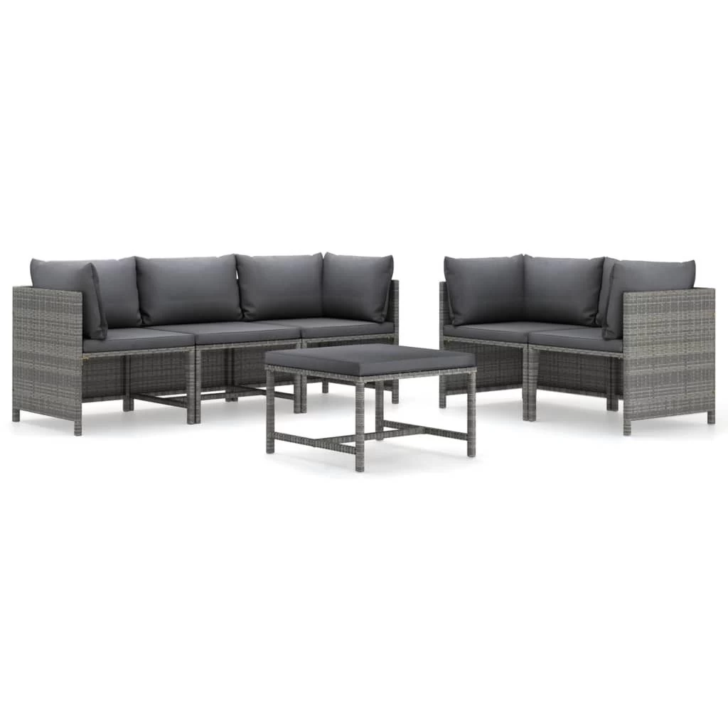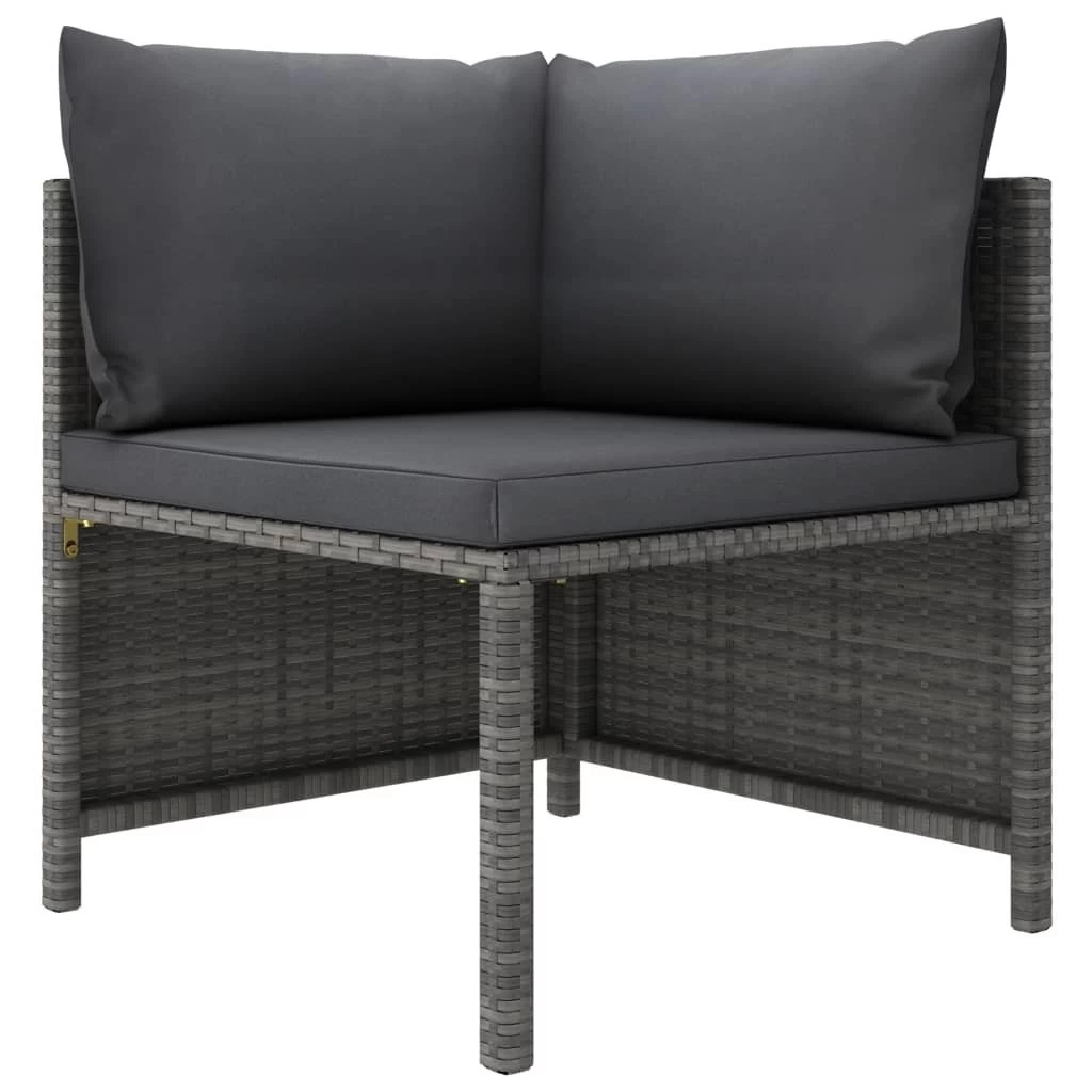 Crea un área de descanso relajante con este juego de muebles de jardín de ratán sintético. Este cómodo set de muebles de jardín, con una estructura de acero con recubrimiento en polvo recubierto con ratán PE, es robusto y fácil de limpiar. Los cojines bien acolchados añaden un plus de comodidad en tu tiempo de ocio. Las fundas de los cojines son extraíbles y lavables gracias a las cremalleras. Además, esta mesita de centro sirve para dejar lo que necesites y también de reposapiés. Este set de muebles de jardín es fácil de mover debido a su construcción ligera. Gracias al diseño modular, puedes colocar el conjunto en la disposición que prefieras. Nota importante: Recomendamos cubrir el set de salón en condiciones de lluvia, nieve y heladas para que sea más duradero. Color: GrisColor del cojín: Gris antracitaMaterial: Ratán PE (polietileno, acero con recubrimiento en polvo Material del cojín: Tela (100% poliésterMaterial de relleno del cojín del asiento: EspumaMaterial de relleno del cojín de respaldo: Fibra de algodónGrosor del cojín del asiento: 5 cmGrosor de cojín de respaldo: 15 cmSofá de esquina:Dimensiones: 60 x 60 x 60 cm (ancho x profundo x altoAnchura del asiento: 57 cmProfundidad del asiento: 57 cmAltura del asiento desde el suelo: 32 cmSofá central:Dimensiones: 54 x 60 x 60 cm (ancho x profundo x altoProfundidad del asiento: 57 cmAltura del asiento desde el suelo: 32 cmMesa de centro:Dimensiones: 60 x 60 x 32 cm (ancho x profundo x altoRequiere montaje: SíLa entrega incluye:4 x Sofás de esquina1 x Sofá central1 x Mesa de centro6 x Cojines de asiento9 x Cojines de respaldo