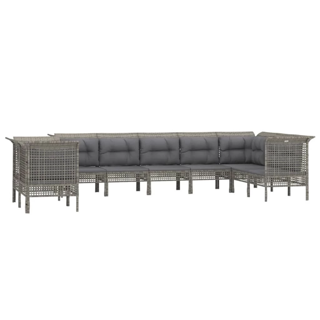 ¡Disfruta de un agradable café en el espacio al aire libre de la casa con este juego de muebles para jardín! Es un aporte perfecto para el jardín y la terraza, y crea además una impresión duradera. Material resistente a la intemperie: El ratán PE, también conocido como ratán sintético, es resistente a la intemperie y fácil de limpiar. La parte exterior se mantiene hermosa durante mucho tiempo. Ofrece una gran calidad, comodidad y aspecto estético.Estructura robusta: La estructura de acero con recubrimiento en polvo hace que el juego de muebles para exterior sea resistente y estable para usar a diario al aire libre.Cómodo asiento: Los respaldos aportan un plus de comodidad al juego de muebles de patio. Además, los cojines gruesos y acolchados proporcionan comodidad al asiento.Diseño modular: Cada artículo es flexible y fácil de mover, por lo que puedes combinarlo con otros segmentos modulares de nuestra tienda web para crear tus propias configuraciones personales de juegos de muebles de jardín. Nota:Para asegurarte de que tus muebles de exterior se mantengan hermosos, recomendamos protegerlos con una funda impermeable. Sofá esquinero de jardín:Color: GrisMaterial: Ratán PE, acero con recubrimiento en polvoDimensiones: 65 x 65 x 75 cm (ancho x profundo x altoAnchura del asiento: 55 cmProfundidad del asiento: 55 cmAltura del asiento desde el suelo: 32 cmCapacidad máxima de carga: 110 kgDiseño de cuadrículaSofá central de jardín:Color: GrisMaterial: Ratán PE, acero con recubrimiento en polvoDimensiones: 55 x 65 x 75 cm (ancho x profundo x altoAnchura del asiento: 55 cmProfundidad del asiento: 55 cmAltura del asiento desde el suelo: 32 cmCapacidad máxima de carga: 110 kgDiseño de cuadrículaCojín:Color: Gris oscuroMaterial: Tela (100% poliésterMaterial del relleno del cojín de asiento: EspumaMaterial del relleno del cojín de respaldo: Fibra de algodónDimensiones del cojín de asiento: 55 x 55 x 3 cm (largo x ancho x grosorDimensiones del cojín de respaldo (grande: 56 x 39 x 10 cm (largo x ancho x grosorDimensiones del cojín de respaldo (pequeño: 48 x 39 x 10 cm (largo x ancho x grosorRequiere montaje: SíLa entrega incluye:5 x Sofás de esquina de jardín4 x Sofás centrales de jardín9 x Cojín de asiento9 x Cojines de respaldo (grande4 x Cojines de respaldo (pequeño