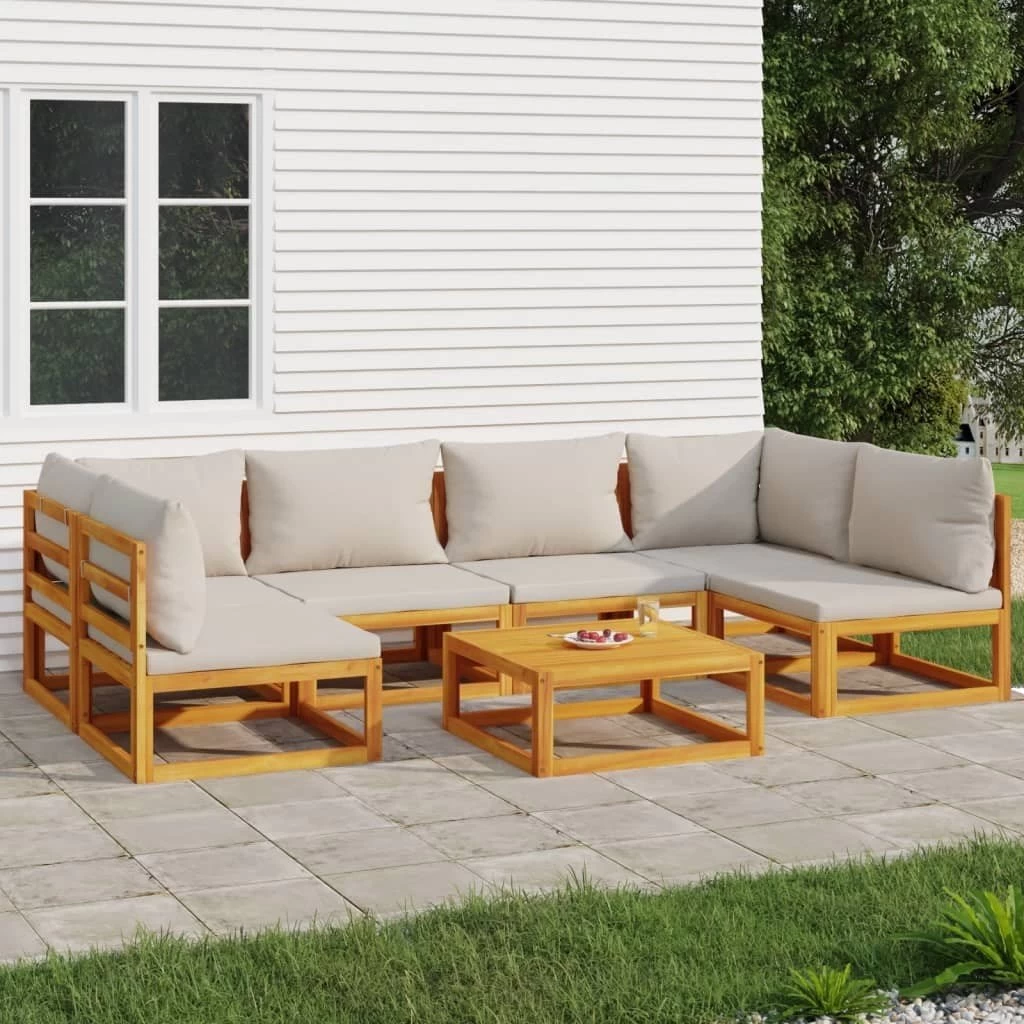 ¡Disfruta de una taza de café o té con un tiempo agradable en el espacio al aire libre de la casa con este elegante juego de muebles de jardín de madera! Madera maciza de acacia: Este juego de muebles de jardín está hecho de madera maciza de acacia. La madera maciza de acacia es un bonito material natural. La madera de acacia es una madera dura tropical, densa, robusta y duradera.Cómodo asiento: El respaldo añade un plus de comodidad al sofá. Además, los cojines gruesos y acolchados proporcionan comodidad al asiento.Mesa práctica: La mesa resistente es perfecta para colocar comidas, bebidas y otros artículos decorativos.Diseño modular: El juego de sofás de jardín es flexible y fácil de mover, por lo que puedes combinarlo con otros segmentos modulares de la tienda web para crear tus propias configuraciones personales de juegos de muebles para jardín. Información útil:Para facilitar al máximo el montaje, cada producto se entrega con un manual. Nota:Para asegurarte de que tus muebles de exterior se mantengan hermosos, recomendamos protegerlos con una funda impermeable. Material de la silla: Madera maciza de acacia con un acabado de aceiteMesa:Dimensiones: 68 x 68 x 29 cm (ancho x profundo x altoSofá esquinero:Dimensiones: 70,5 x 70,5 x 65 cm (ancho x profundo x altoAltura del asiento desde el suelo (sin cojín: 29 cmCapacidad de carga máxima: 110 kgSofá central:Dimensiones: 68 x 70,5 x 65 cm (ancho x profundo x altoAltura del asiento desde el suelo (sin cojín: 29 cmCapacidad de carga máxima: 110 kgCojín:Color del cojín: Gris claroMaterial de la funda del cojín: Tela (100% poliésterMaterial de relleno: Espuma, fibra de algodónDimensiones del cojín de asiento: 68 x 68 x 6 cm (ancho x profundo x altoDimensiones del cojín de respaldo (grande: 68 x 45 x 15 cm (ancho x profundo x altoDimensiones del cojín de respaldo (pequeño: 58 x 45 x 15 cm (ancho x profundo x altoLa entrega incluye:2 x Sofás esquineros4 x Sofás centrales1 x Mesa de centro6 x Cojines de asiento6 x Cojines de respaldo (grande2 x Cojines de respaldo (pequeño