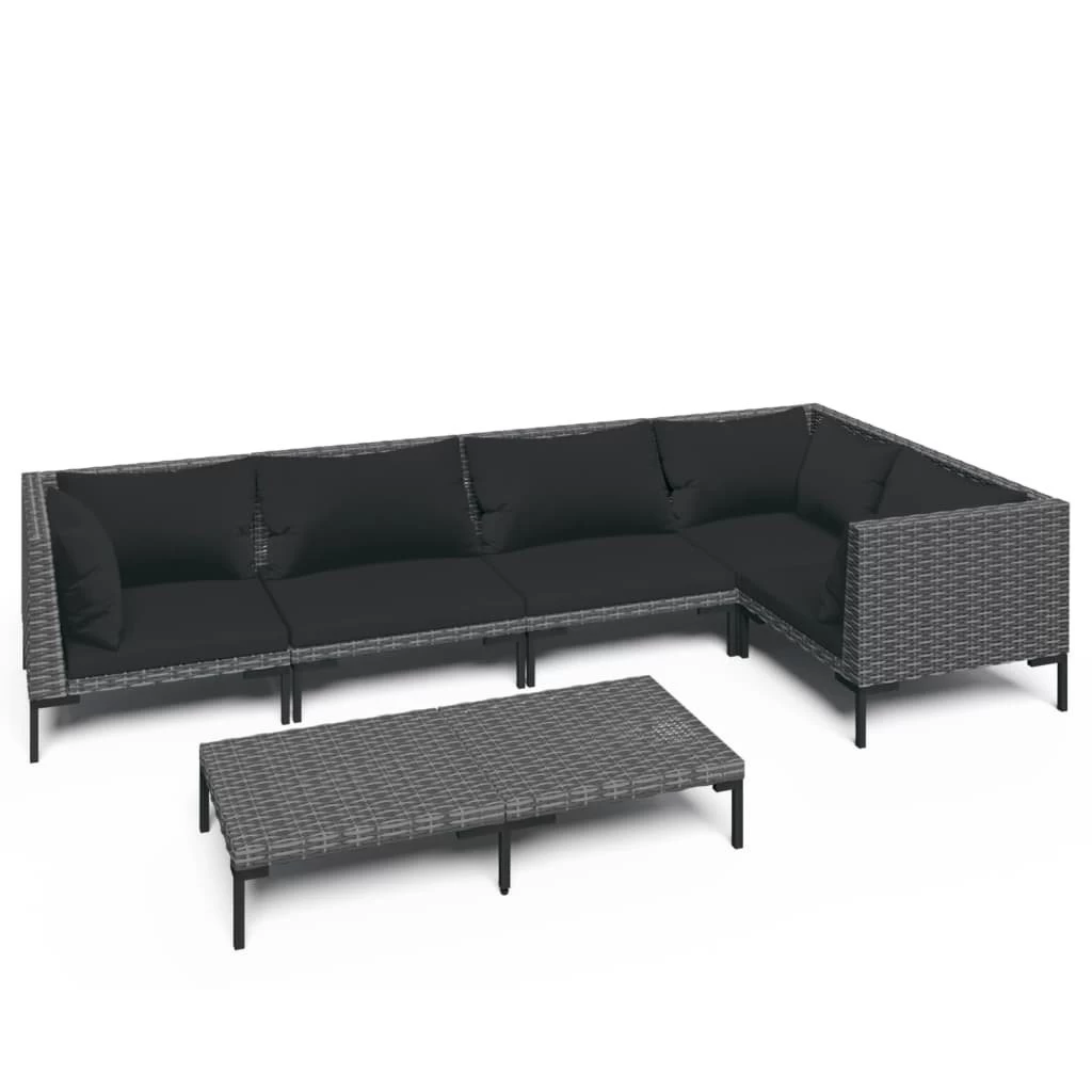 ¡Relájate y disfruta del espacio al aire libre de tu casa con este clásico juego de muebles para jardín! Estructura robusta: Con una estructura de acero con recubrimiento en polvo, el juego de muebles de patio es robusto y duradero. Construcción ligera: La construcción ligera hace que el juego de sofás sea fácil de mover.Material de primera calidad: Hecho de ratán PE semicircular, este juego de muebles para exteriores es resistente a la intemperie y al agua, fácil de limpiar y mantener. Cómodos cojines y almohadas: Los cojines y las almohadas acolchados gruesos y extraíbles brindan una comodidad óptima para que te sientes al aire libre. Nota:Recomendamos cubrir el conjunto de jardín en caso de lluvia, nieve y heladas para que dure más tiempo. Además, te recomendamos limpiarlo regularmente para alargar la vida de los muebles de exterior. No lo dejes al aire libre sin protección innecesariamente.Limpieza: Usa una solución de jabón suaveAlmacenamiento: Si es posible, guárdala en un lugar fresco y seco en el interior. Si el producto se almacena en el exterior, protégelo con una cubierta impermeable. Limpia y seca el exceso de agua o nieve de las superficies planas después de una lluvia o nevada. Permite la ventilación para evitar daños relacionados con la humedad. Color del ratán: Gris oscuroColor del cojín: NegroMaterial: Acero con recubrimiento en polvo, ratán PE semicircular, tablero de PC, tela (100 % poliésterMaterial de relleno: EspumaSofá central:Dimensiones: 70 x 70 x 61 cm (ancho x profundo x altoDimensiones de asiento: 70 x 60 cm (ancho x profundoAltura del asiento desde el suelo: 21 cmDimensiones del cojín del asiento: 68 x 58 cm (ancho x profundoDimensiones del cojín del respaldo: 68 x 37 cm (ancho x altoSofá esquinero:Dimensiones: 70 x 70 x 61 cm (ancho x profundo x altoDimensiones del asiento: 60 x 60 cm (ancho x profundoAltura del asiento desde el suelo: 21 cmDimensiones del cojín del asiento: 58 x 58 cm (ancho x profundoDimensiones del cojín del respaldo: 50/59 x 37 cm (ancho x altoMesa de centro:Dimensiones: 120 x 55 x 21 cm (largo x ancho x altoRequiere montaje: SíLa entrega contiene:2 x Sofás centrales3 x Sofá esquinero1 x Mesa de centro5 x Cojines de asiento8 x Cojines de respaldo