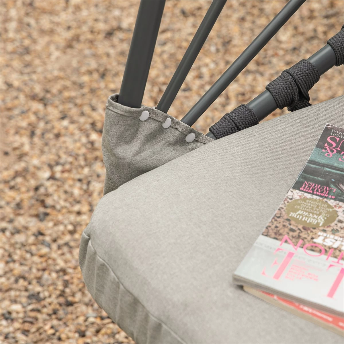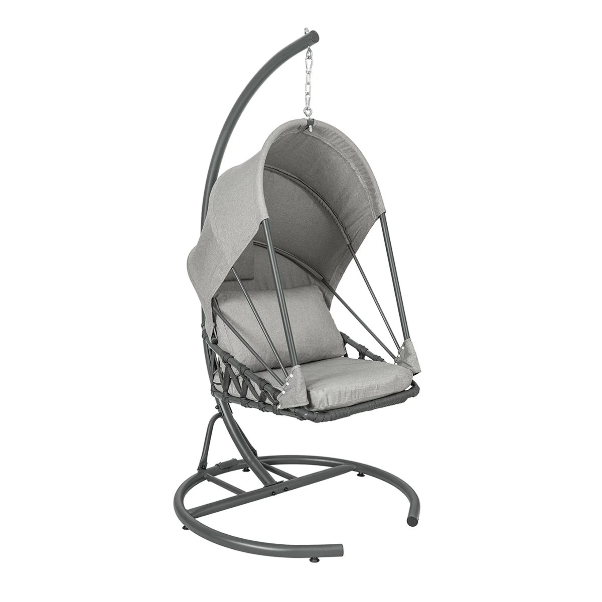 Material: Estructura de hierro resistente e inoxidable. Cojín en tejido oxford y espuma. Dimensiones de la silla (An x Pr x Al: 95 x 95 x 187 cm. Altura del asiento: 50 cm. Capacidad máxima de carga: 120 kg.El soporte adopta un diseño en forma de C para garantizar una buena estabilidad y seguridad. El respaldo y los cojines son todos desenfundables y lavables. Cada anillo se puede quitar o colgar para ajustar la altura según sus necesidades.El respaldo ergonómico, los cojines cómodos, todo esto asegura una comodidad adicional al sentarse. La superficie del cojín está hecha de tela oxford, alta solidez del color, puede soportar la luz del sol, la lluvia y no se desvanece fácilmente.Ideal para espacios exteriores como jardines, terrazas, balcones o patios, crea tu propio pequeño refugio para relajarte. Estilo contemporáneo arqueado de gran elegancia.Con instrucciones de montaje ilustradas y piezas numeradas, el montaje es fácil.