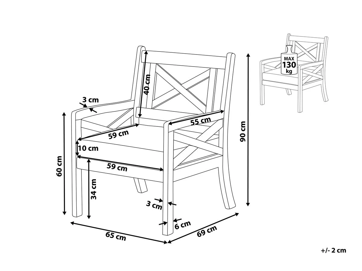 Práctica silla de jardín hecha de madera de acacia. Añade a tu zona exterior esta silla de jardín práctica y versátil. Está fabricada a partir de madera de acacia de alta calidad. El cojín de asiento acolchado repele la suciedad con facilidad. Viene con una funda extraíble de poliéster. La estructura abierta y brillante aporta un toque marítimo al diseño. Detalles: Tipo de Producto: Silla de jardín Estilo: Tradicional Color: Blanco Tipo de material: Madera maciza Material principal: Madera de acacia Material adicional: Poliéster Material de las patas: Madera maciza Material del asiento: Tejido Composición del Material: 100% Poliéster Apoyabrazo: Sí Acabado: Aceitado Plegable: No Densidad de espuma del asiento: 18 kg/m3 Apilable: No Dimensiones: Altura del apoyabrazos: 60 cm Profundidad: 69 cm Espesor del asiento: 10 cm Altura del asiento: 44 cm Ancho: 65 cm Altura: 90 cm Superficie del asiento: 59×59 cm Peso: 22 kg Capacidad de peso: 130 kg La oferta incluye: 1 x Silla, 1 x Cojín del asiento Ventajas: El grueso acolchado del asiento brinda comodidad, Estilo escandinavo minimalista, Ideal para uso al aire libre, Resiste a todo tipo de clima, Resistencia UV 4 (ISO 105-B02, Fácil de desplazar Información de montaje: Requiere montaje parcial. 5-15 min. Información adicional: El producto viene con un libro de cuidados detallado para ayudarte a mantener tus muebles en las mejores condiciones durante muchos años. Consulta estos consejos para garantizar el mantenimiento adecuado de tus muebles nuevos – encontrarás las instrucciones de mantenimiento junto con el manual de montaje. Texto de resistencia: Gracias a su resistencia al agua, puedes utilizar el producto al aire libre y dejarlo a la intemperie durante lluvias ligeras. Si no es posible guardarlo en un lugar cerrado y protegido, recomendamos utilizar una funda protectora. La exposición prolongada a la humedad puede provocar daños en el mueble. Resistencia: Agua ligera / humedad Consejos de mantenimiento: Madera de acacia: 1.Durante el invierno o en condiciones climáticas adversas, utilice una funda protectora o guarde los muebles en el interior 2.Los muebles con acabado de aceite deben volverse a engrasar antes de ponerlos en uso y al menos una vez al año, especialmente en el clima húmedo 3.Limpiar con un limpiador suave y un paño suave en la dirección de la veta. Secar con un paño inmediatamente después de limpiar. Poliéster: 1.Lavar a mano o seleccionar un ciclo de lavado de lana (30 ° C, a menos que el fabricante especifique lo contrario. Lavar del revés con la cremallera cerrada 2.Cuando no esté en uso, manténgalo en un lugar limpio y seco para protegerlo de las condiciones atmosféricas 3.No secar en secadora y no planchar.