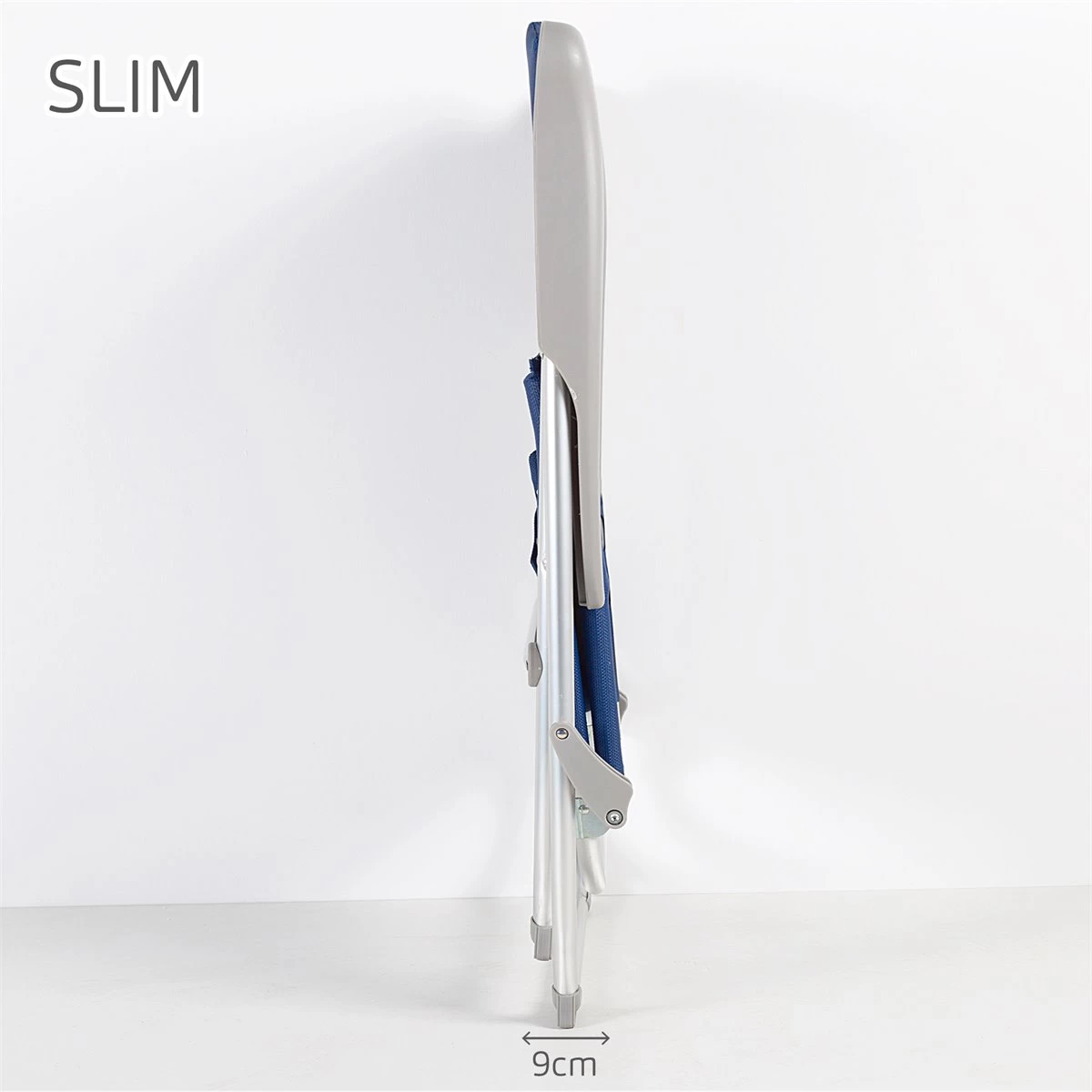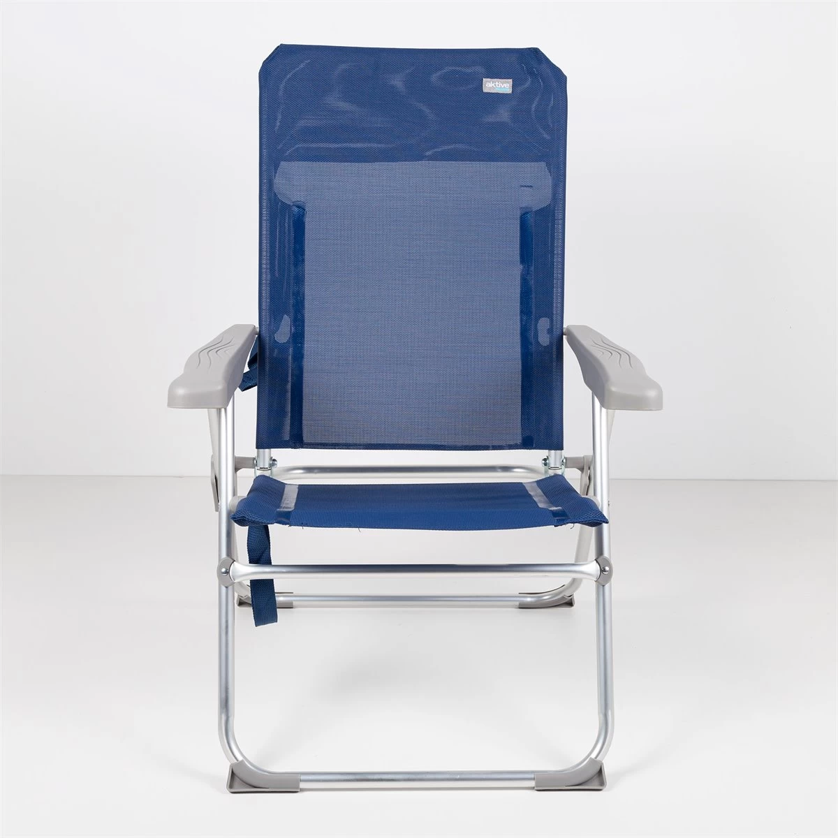 Esta silla de playa Aktive Beach ha sido diseñada para relajarse durante horas en la playa y ocupar el mínimo espacio cuando está plegada, ya que su característica principal es el plegado Slim. Está fabricada con estructura de aluminio plateada (soporta hasta 110 kg, su tejido es textileno reforzado color azul marino y los reposabrazos ergonómicos son de plástico resistente color gris. La silla ofrece gran comodidad gracias al respaldo multiposición fácil de regular con los reposabrazos (6 posiciones y a la ausencia de tubo delantero en las piernas. Las patas llevan incorporados topes antivuelco para más estabilidad y seguridad durante su uso y cuenta con costuras termoselladas en respaldo y asiento para mayor resistencia y durabilidad. Gracias a su plegado extraplano, a su peso ligero y a las asas de mano incorporadas, es muy fácil de transportar, almacenar y apilar.