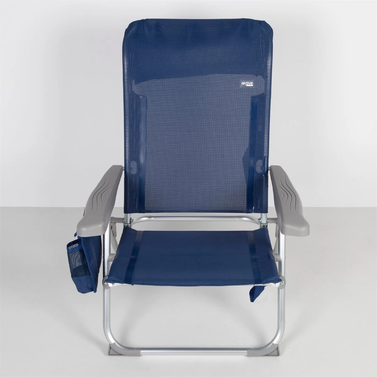 Esta silla de playa Aktive Beach ha sido diseñada para relajarse durante horas en la playa y ocupar el mínimo espacio cuando está plegada, ya que su característica principal es el plegado Slim. Está fabricada con estructura de aluminio plateada (soporta hasta 110 kg, su tejido es textileno reforzado color azul marino y los reposabrazos ergonómicos son de plástico resistente color gris. La silla ofrece gran comodidad gracias a su cojín acolchado, al respaldo multiposición fácil de regular con los reposabrazos (6 posiciones, a la ausencia de tubo delantero en las piernas y al bolsillo lateral con dos compartimentos. Las patas llevan incorporados topes antivuelco para más estabilidad y seguridad durante su uso y cuenta con costuras termoselladas en respaldo y asiento para mayor resistencia y durabilidad. Gracias a su plegado extraplano, a su peso ligero y a las asas de mano incorporadas, es muy fácil de transportar, almacenar y apilar.