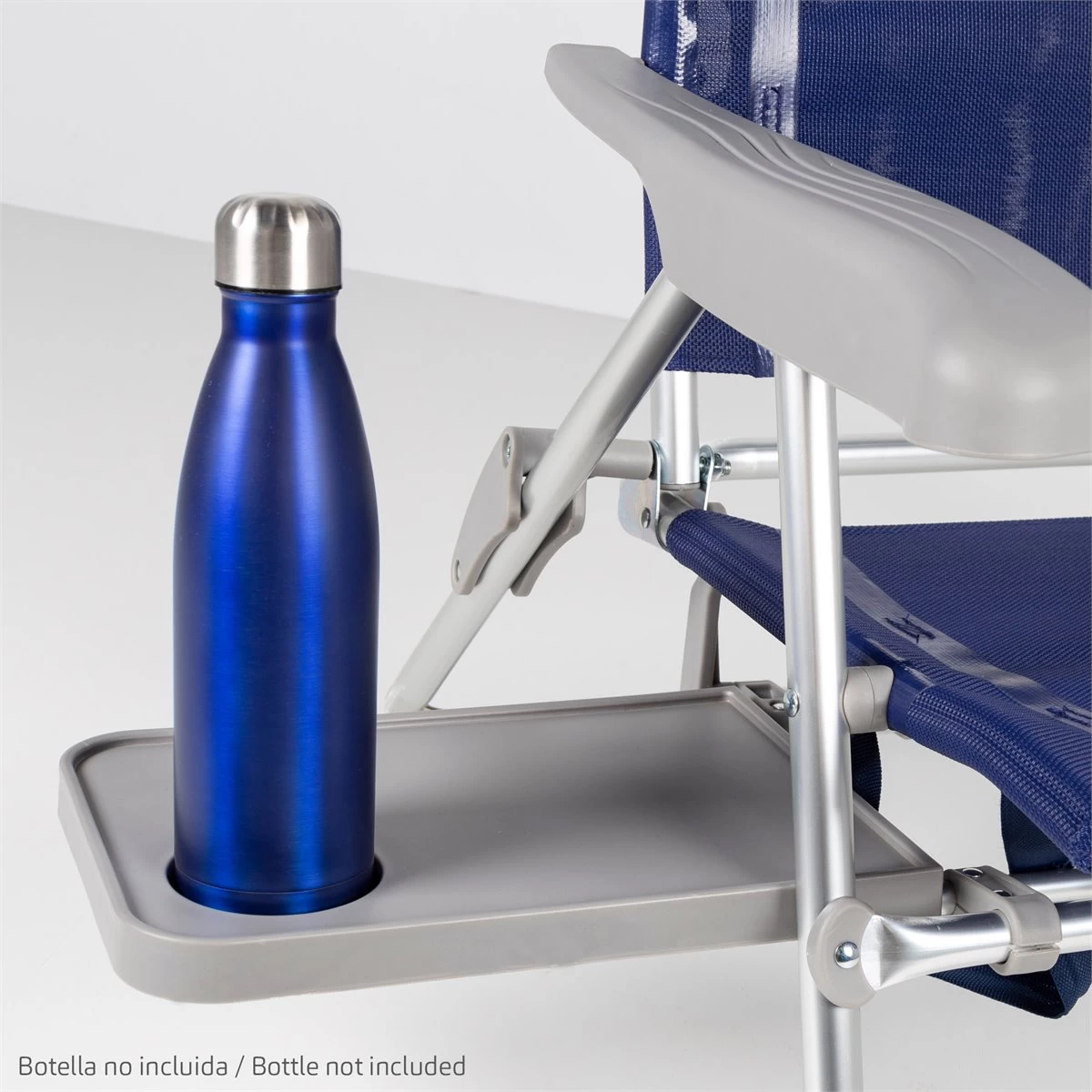 Esta silla de playa Aktive Beach ha sido diseñada para relajarse durante horas en la playa y ocupar el mínimo espacio cuando está plegada, ya que su característica principal es el plegado Slim. Está fabricada con estructura de aluminio plateada (soporta hasta 110 kg, su tejido es textileno reforzado color azul marino y los reposabrazos ergonómicos son de plástico resistente color gris. La silla ofrece gran comodidad y funcionalidad gracias a su cojín acolchado, al respaldo multiposición fácil de regular con los reposabrazos (6 posiciones, a la ausencia de tubo delantero en las piernas y a la mesa extraíble situada debajo del asiento. Las patas llevan incorporados topes antivuelco para más estabilidad y seguridad durante su uso y cuenta con costuras termoselladas en respaldo y asiento para mayor resistencia y durabilidad. Gracias a su plegado extraplano, a su peso ligero y a las asas de mano incorporadas, es muy fácil de transportar, almacenar y apilar.