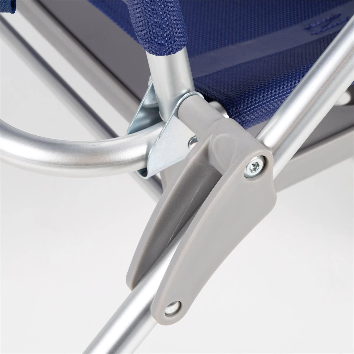 - Materiales: tejido de textileno reforzado 2×1 (resistente, transpirable y fácil de limpiar, costuras termoselladas, estructura de aluminio (antioxidante y duradera y reposabrazos de plástico resistente