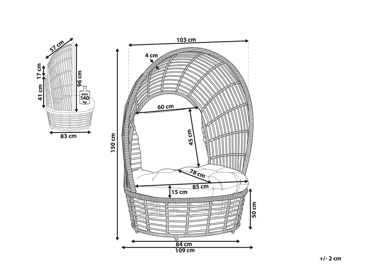 Silla de diseño. Añade elegancia a tu interior con esta silla de diseño elegante. La estructura de metal está recubierta con ratán sintético resistente y duradero. El cojín de asiento y el respaldo alto proporcionan la máxima comodidad. Ideal como alternativa a un sillón de sala estar. Detalles: Tipo de Producto: Sillón Estilo: Boho Color: Beige Tipo de material: Mimbre sintético Material principal: Ratán Material adicional: Metal Material de las patas: Metal Material del asiento: Tejido Composición del Material: 100% Poliéster Apoyabrazo: No Protectores para patas: No Diseño: Sólido Reclinable: No Construcción del asiento: Metal Densidad de espuma del asiento: 25 kg/m3 Dimensiones: Profundidad: 83 cm Espesor del asiento: 15 cm Altura del asiento: 50 cm Ancho: 109 cm Altura: 150 cm Superficie del asiento: 83×85 cm Peso: 25 kg Capacidad de peso: 140 kg La oferta incluye: 1 x Sillón, 1 x Cojín del asiento, 1 x Cojín del respaldo Ventajas: Respaldo alto y asiento muy cómodo, Forma ligeramente curva para un confort óptimo, Elegante pieza decorativa, Material ligero y durable, Resistencia UV 5 (ISO 105-B02 Información de montaje: Requiere montaje parcial. 20-40 min. Información adicional: Ten en cuenta que el producto es sensible a condiciones climáticas adversas, por lo que, cuando no esté en uso, debe ser almacenado en el interior o en un lugar cubierto. Para una mayor estabilidad y seguridad de uso, se recomienda verificar 2 semanas después de la instalación que el montaje del producto ha sido realizado de forma correcta. Revisa, al menos una vez cada 3 meses, que los tornillos estén bien apretados. El producto viene con un libro de cuidados detallado para ayudarte a mantener tus muebles en las mejores condiciones durante muchos años. Consulta estos consejos para garantizar el mantenimiento adecuado de tus muebles nuevos – encontrarás las instrucciones de mantenimiento junto con el manual de montaje. Consejos de mantenimiento: Ratán: 1.Evite la exposición prolongada a la luz solar directa intensa, así como el contacto con la humedad y la lluvia, 2.Limpiar con un paño suave húmedo y secar siempre después, 3.Los muebles deben almacenarse adentro cuando no estén en uso Metal: 1.Los muebles de acero y sus elementos no deben exponerse al agua. De lo contrario, existe la posibilidad de que el agua oxidada salga de las tuberías del marco 2.Cuando no estén en uso, los muebles deben guardarse en el interior o bajo una cubierta protectora 3.Para aumentar la durabilidad del artículo, manténgalo seco y recuerde la limpieza regular 4.Cualquier daño a la capa de pintura exterior debe protegerse de la humedad 5.Para garantizar la protección contra la corrosión, evite los limpiadores alcalinos o ácidos. Después de limpiar, secar bien 6.Quite las tapas protectoras con regularidad para que salga todo el líquido, déjelas secar y utilice un spray anticorrosión si es necesario 7.Limpiar con detergentes suaves.