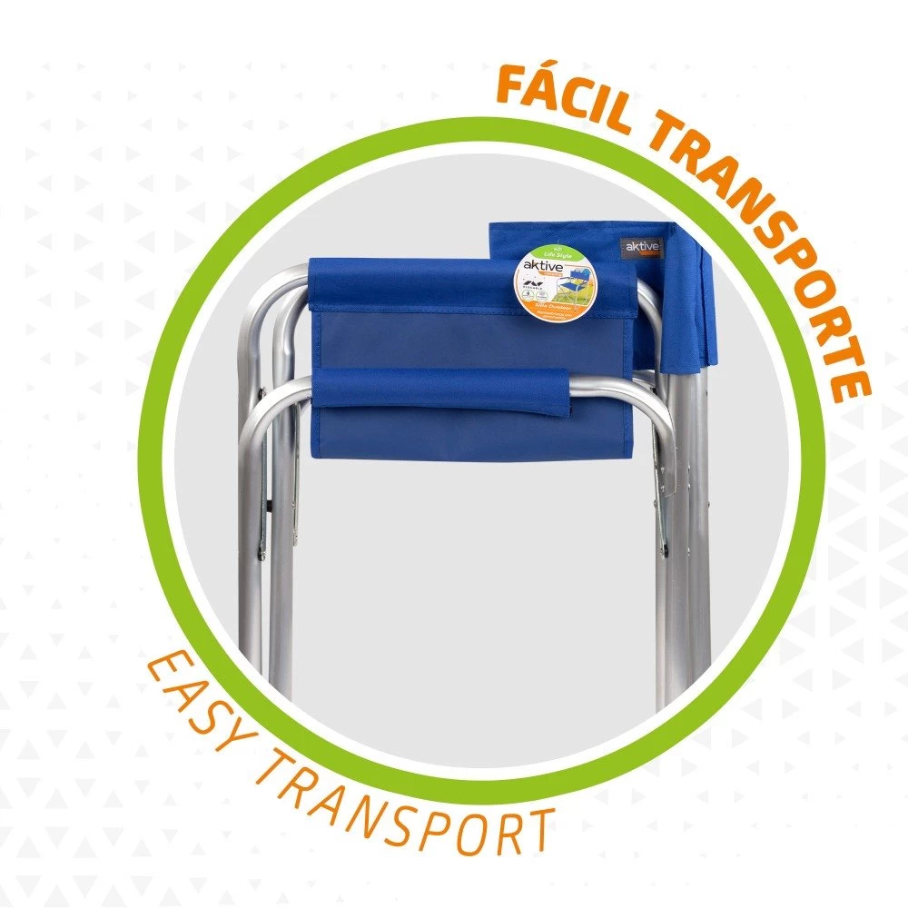 Silla plegable estilo director de Aktive, con medidas desplegada de 54 x 49 x 78 cm, altura del suelo de 45 cm y distancia entre los reposabrazos de 56,5 cm. La silla mide desplegada 49 x 78 cm. Su asiento, respaldo y reposabrazos con almohadilla están fabricados con tela Oxford 600D en color azul. Cuenta con estructura de aluminio que soporta hasta 100 kg de peso y con tacos antideslizantes en las patas. Se pliega en un solo movimiento para transportarla cómodamente y guardarla sin apenas ocupar espacio. ¡Disfruta como nunca de tus momentos al aire libre con Aktive!